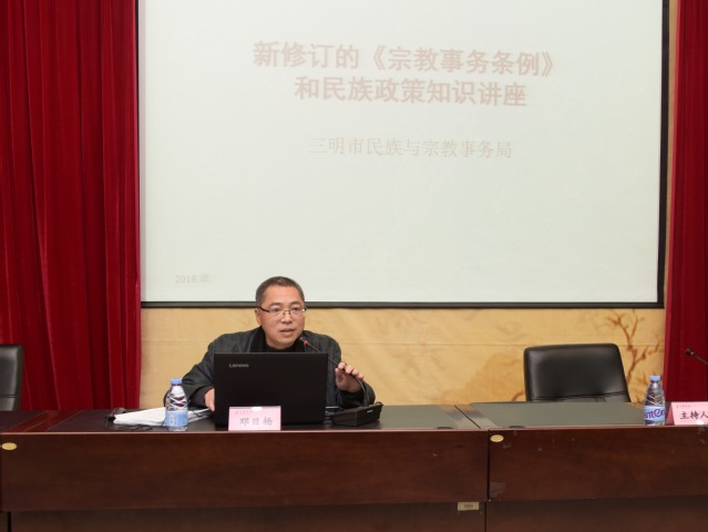 为更好地贯彻落实党的十九大关于“全面贯彻党的宗教工作基本方针”的要求,进一步增强做好高校宗教工作的责任感、紧迫感,进一步提高依法依规处理宗教事务的能力,切实维护好学校和社会的和谐稳定,12月19日,校党委党校和统战部邀请我校校友、三明市民族与宗教事务局主持工作副局长邓日杨来校宣讲新修订的《宗教事务条例》。