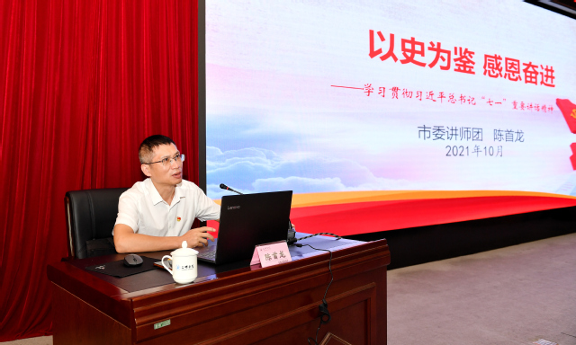 陈首龙团长从“一个庄严宣告、一个奋斗主题、四个伟大成就、一个伟大精神、“九个必须”的根本要求、一个历史任务、一个殷切期望、一个伟大号召和以史为鉴再创三明新辉煌”等九个方面为我们提纲挈领,系统透彻地解读了习近平总书记“七一”重要讲话精神,并就如何贯彻落实提供了意见与建议。陈团长以扎实的理论功底、生动的语言和丰富的经验,为参会人员学习好、宣传好、贯彻好习近平总书记“七一”重要讲话精神理清了思路、拓宽了视野,为学深悟透做实讲话精神打开了一扇窗。