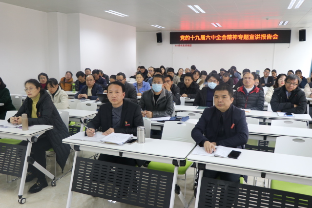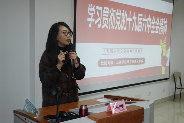 会上,欧阳秀敏博士以《学习宣传贯彻党的十九届六中全会精神》为题,紧紧围绕党的十九届六中全会审议通过的《中共中央关于党的百年奋斗重大成就和历史经验的决议》(以下简称《决议》),从“深刻把握召开党的十九届六中全会作出新的历史决议的重大意义”“深刻把握党的第三次历史《决议》主要内容”和“深刻把握党百年奋斗的历史意义和历史经验,走好新的赶考之路”等三个方面,对全会精神进行全面宣讲和深入解读,重点阐述中国共产党百年奋斗的重大成就和历史经验,以及十九届六中全会提出的一系列新思想、新观点、新要求。