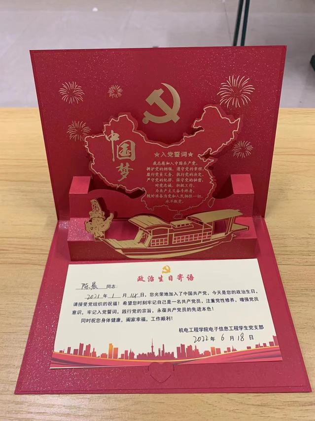 明身份,赠送一张政治“生日”卡。“这张生日卡,我期待了很久,作为毕业生党员,这是我最后一次参加学校党支部活动,有些感伤,但是又是新的起航。上一届为毕业生党员挑选礼物的时候我就很想要这样一张贺卡,象征我们永恒的入党初心”党员陈丽琴激动的说道。活动现场,由支部书记为每一位毕业生党员赠送一张政治生日贺卡,重温重要时刻。政治生日对每一位党员来说,都是具有特殊意义的日子。希望毕业生党员们要时刻牢记入党时的铮铮誓言,牢记入党的初心,自觉保持先进性,发挥先锋模范作用。无论身处何地,都要秉持“为人民服务”的信仰,始终保持艰苦奋斗的昂扬精神。