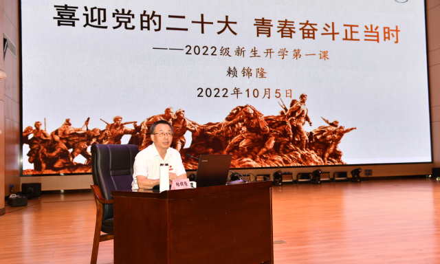 10月5日下午,校党委书记赖锦隆以“喜迎党的二十大,青春奋斗正当时”为题在艺术楼音乐厅为教育与音乐学院、马克思主义学院2022级新生讲授“开学第一课”。