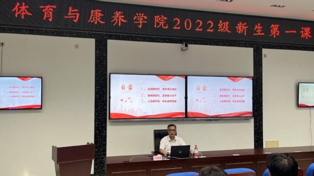 9月28日下午,副校长张君诚在靖远楼101教室为体育与康养学院2022级新生上第一堂思政课。