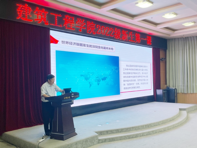 10月6日晚7点,副校长谢松明在图书馆四楼报告厅为经济与管理学院、建筑工程学院2022级新生讲授“开学第一课”。
