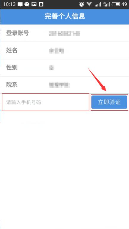 3下载完成后、点击APP进入登陆界面、输入学号或者工号和初始密码(123456)进行登陆。登陆完成后、核对学生信息是否正确、填写手机号码接收验证码进行注册登陆。