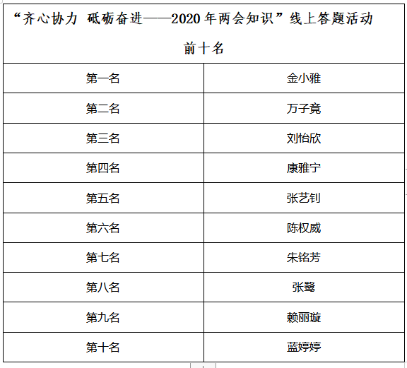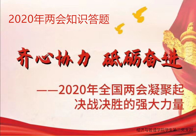 2020年6月3日,三明学院经济与管理学院学生第二党支部通过微信问卷星小程序开展“齐心协力 砥砺奋进——2020年两会知识”线上答题活动。此次答题活动旨在“以赛促练、以赛促学、以赛促进”,帮助支部成员检验理论学习成果,从而推动2020年两会精神学习向纵深推进。参与答题活动的有党员、积极分子共133人次。金小雅、万子竟、刘怡欣等同志获得答题活动前十名。