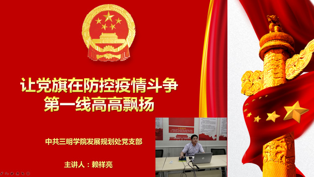 6月24日下午,为贯彻落实学校关于开展基层党组织常态化疫情防控“四个一”行动的部署,发展规划处党支部组织全体党员在行政楼一楼会议室聆听《让党旗在防控疫情斗争第一线高高飘扬》专题微党课,党课由支部书记讲授。