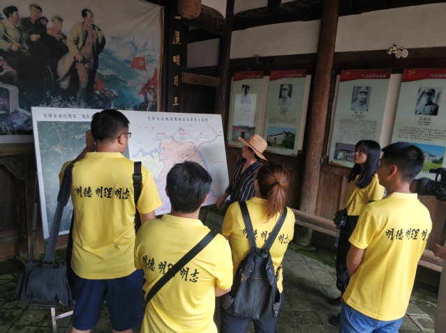 在林畲毛泽东旧居,实践队师生们听讲解员解说《如梦令.元旦》的来历,回顾红四军二纵队进军清流路线图,在革命文物参观和历史场景重现中深切感受到革命先辈无畏艰险、忘我奋斗的精神。