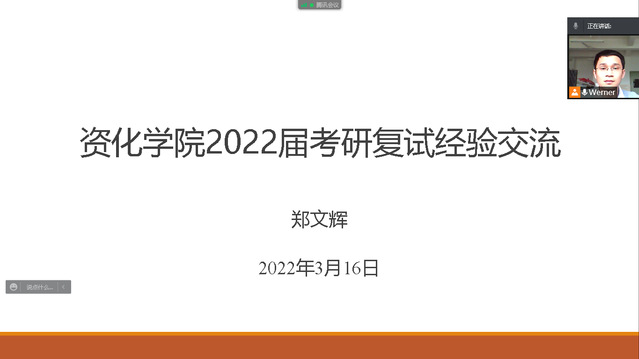 为助力2022届考研学子顺利完成研究生复试与调剂,提高考研录取率,3月16日下午资源与化工学院邀请美丽中国研究院副院长郑文辉博士作考研复试指导培训讲座,讲座通过腾讯会议线上举行。