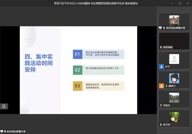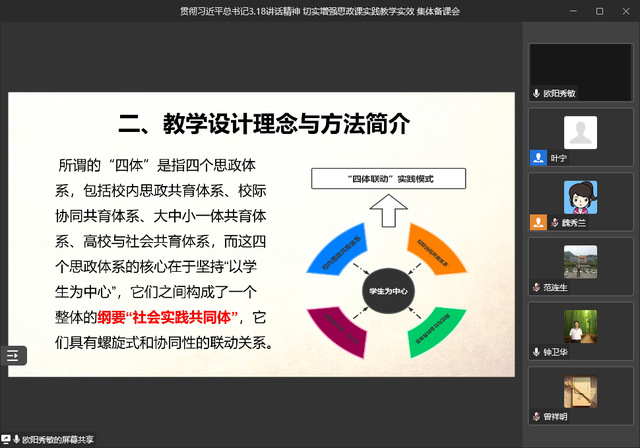 备课会上,青年教师欧阳秀敏就《中国近现代史纲要》课程社会实践活动进行交流汇报,她从多年的教学工作中总结了是学生社会实践调查报告中存在的问题,以及单纯以实践报告形式开展实践教学的弊端,从教学目标的达成出发分享了自己对实践教学的设计理念,提出了在丰富实践形式的基础上,打通区域性育人壁垒,构建“校内思政共育体系”“校际协同共育体系”“大中小一体共育体系”“高校与社会公寓体系”的“四体联动”实践模式,在提升思政课实践育人实效的同时,推动思政课程与课程思政同向同行。