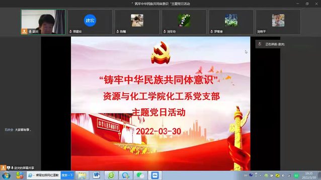 为深入学习贯彻习近平总书记关于加强和改进民族工作的重要思想以及中央、省委有关工作部署和校党委有关工作要求,坚持以铸牢中华民族共同体意识为主线,持续深化全国民族团结进步示范单位建设,引导广大师生进一步凝聚“民族团结一家亲,同心共筑中国梦”的强大合力。3月30日晚,资源与化工学院党委3个系教工党支部通过线上形式联合开展“铸牢中华民族共同体意识”主题党日活动。教工党支部的全体党员参加,由化工系教工党支部支部书记主持,资源与化工学院负责人以普通党员身份参加活动。