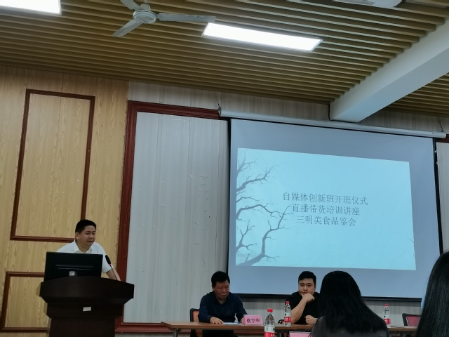 5月8日,三明学院自媒体实操项目驱动创新班开班仪式在厚德楼举行。来自三明市供销投资集团有限责任公司、罗大胡子食品有限公司等六家食品公司负责人,三明学院教务处和经济与管理学院领导和创新班全体学员参加开班仪式。