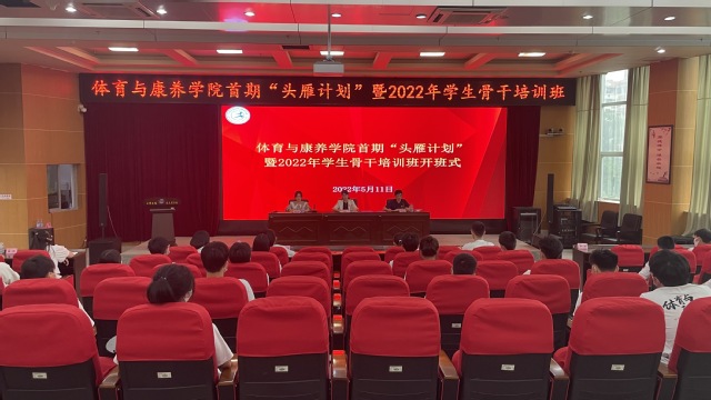 5月11日,体育与康养学院首期“头雁计划”暨2022年学生骨干培训班在图书馆学术报告厅开班。体育与康养学院党委书记、副书记、团委负责人、辅导员以及72名培训班学员参加开班式。