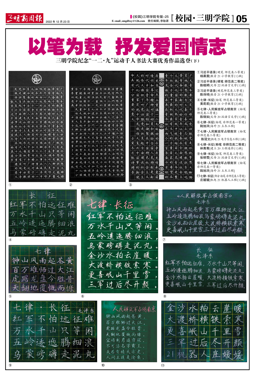 【三明新周报】以笔为载 抒发爱国情志——三明学院纪念“一二·九”运动千人书法大赛优秀作品选登
