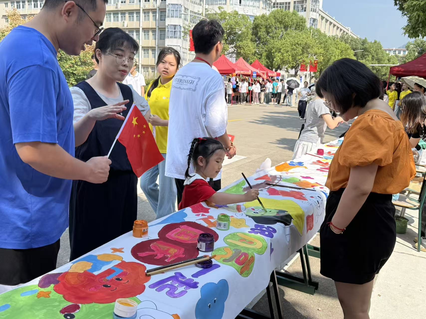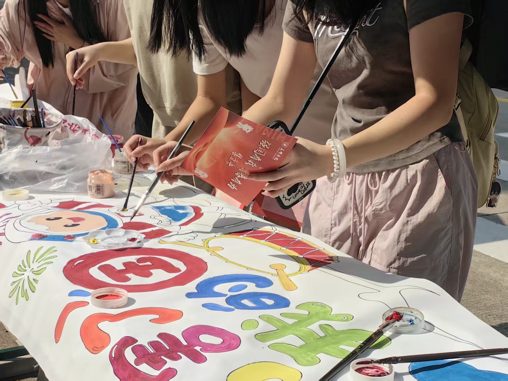 活动现场,一幅十米长卷在广场上缓缓铺展,其上预先勾勒的图案极具巧思,“欢度国庆”的艺术字大气醒目,中秋玉兔憨态可掬,团圆明月皎洁动人,还有象征祖国山河的元素点缀其间。师生们齐聚长卷两侧,手持画笔,蘸取五彩颜料,或凝神细描,或大胆着色。有的专注于为卡通人物绘制绚丽服饰,有的则用心晕染“中国”二字的渐变色彩。更有市民朋友被深深吸引,小朋友们握着画笔,在长卷的童趣板块尽情创作,留下纯真又温暖的色彩印记