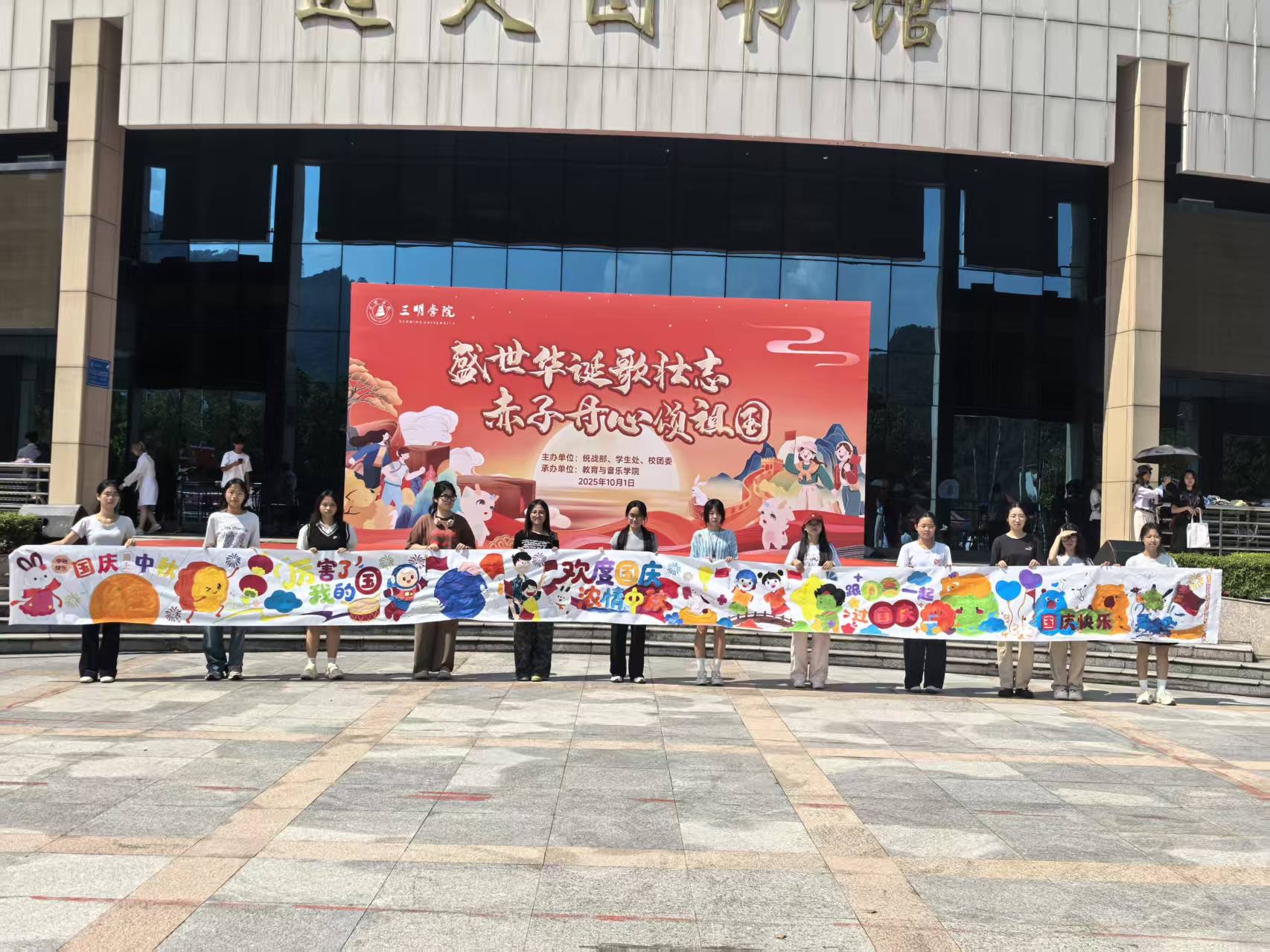 10月1日,三明学院逸夫图书馆前广场热闹喧腾,教育与音乐学院精心策划的“丹青绘双节,长卷展宏图”国庆中秋主题长卷绘画活动盛大开启,以艺术之笔共贺家国双节。