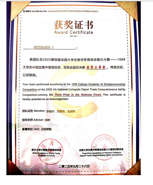 此次获奖是学院深化产教融合的生动成果,不仅提升了学子运用AI技术开展创业实践的能力,更为数字贸易领域创新型人才培养提供了宝贵经验,激励更多学子以专业所长拥抱数字经济浪潮。