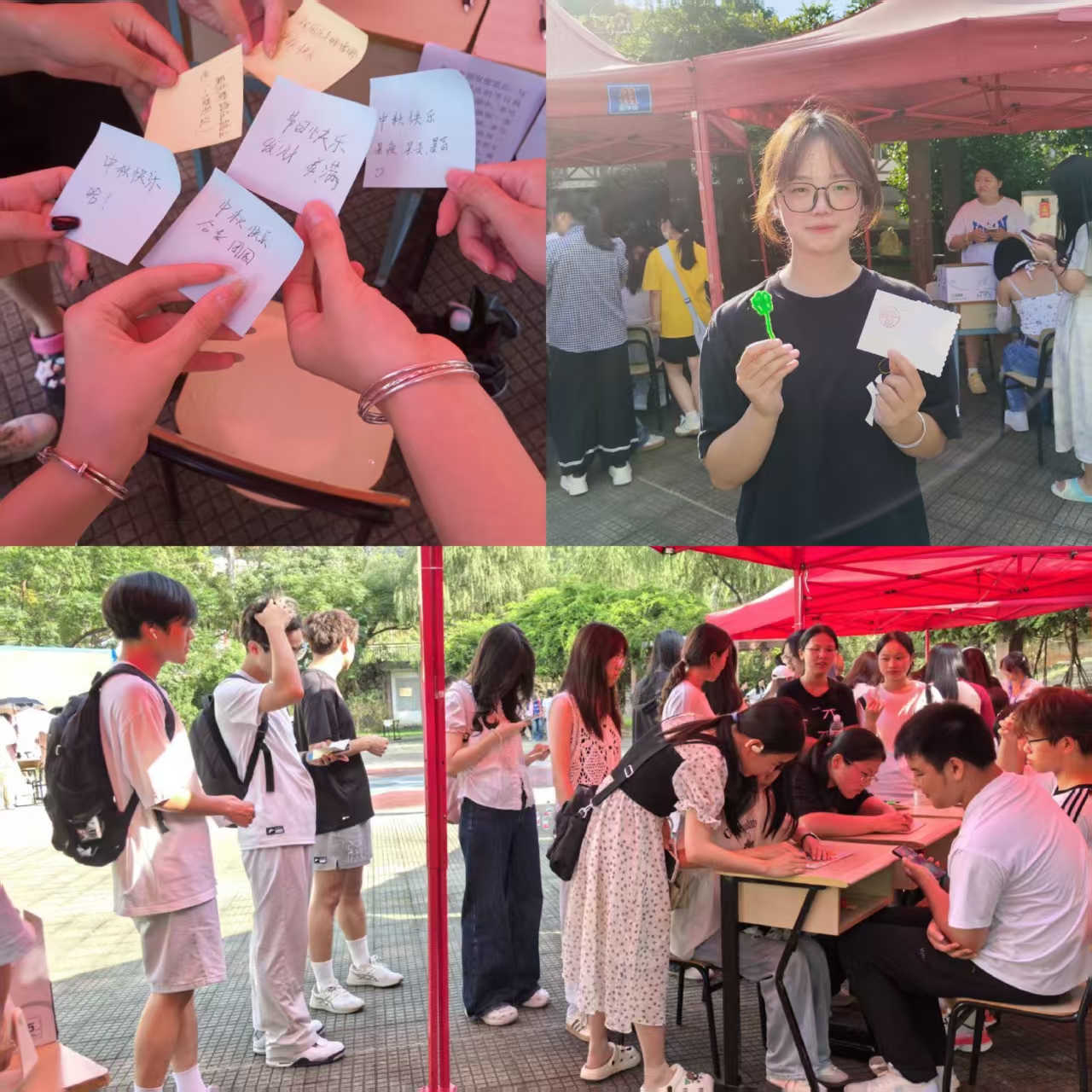 9月27日,石榴籽广场上,祝福传递区排起长龙。800余张手写便签在抽奖箱中流转,各类祝福交替呈现。游园会现场,“易”盏秋月灯谜会区,明院学子们用扭扭棒编织出玉兔、灯笼等造型;中国地图拼图区,最快记录保持者仅用1分01秒完成拼接;套圈游乐区,彩环精准落定的欢愉声此起彼伏。“此次活动兼具趣味性与教育意义,各类创意环节激发大家参与热情的同时,更强化了学生对民族团结深刻内涵的认识。”三明学院易班学生工作站组长杨小艺说道。
