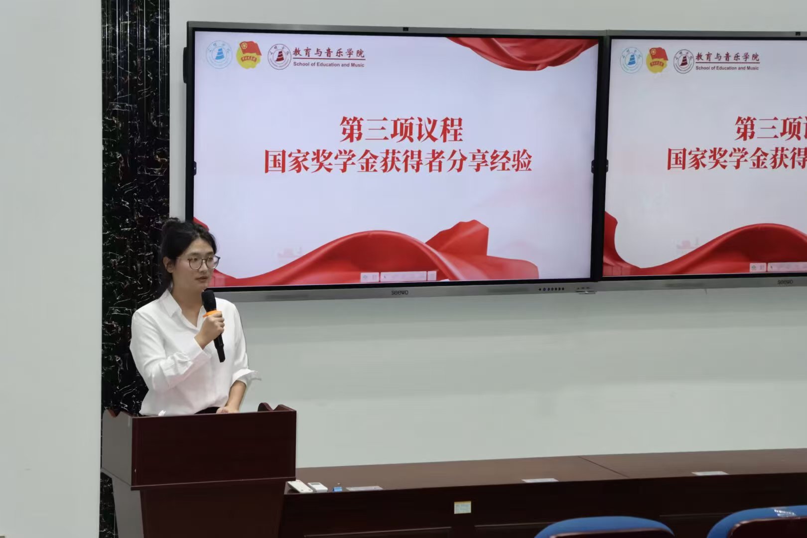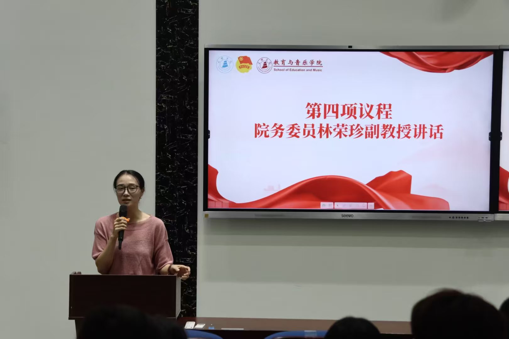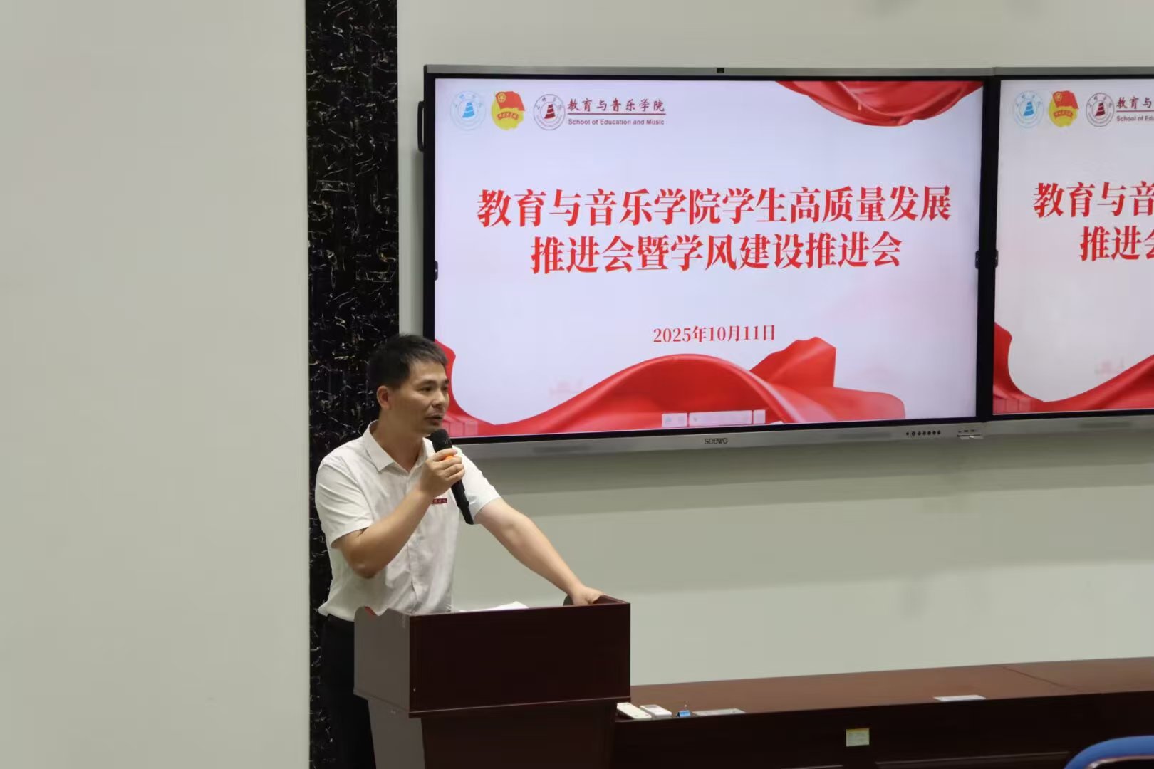 10月11日下午,教育与音乐学院于靖远楼101报告厅召开学生高质量发展暨学风建设推进会。学院党委班子成员代表、全体辅导员、各专业成绩前15%学生代表及学生骨干参会。