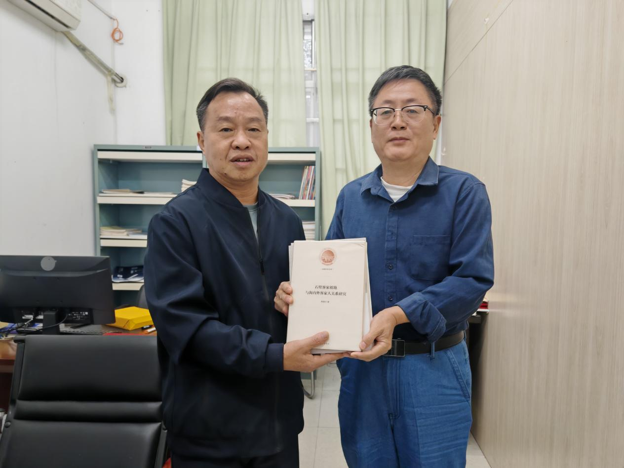 座谈会开始前,市客家联谊会一行参观了三明学院客家文化研究所,蔡登秋老师代表研究所向市客家联谊会赠送客家文化研究的相关书籍。