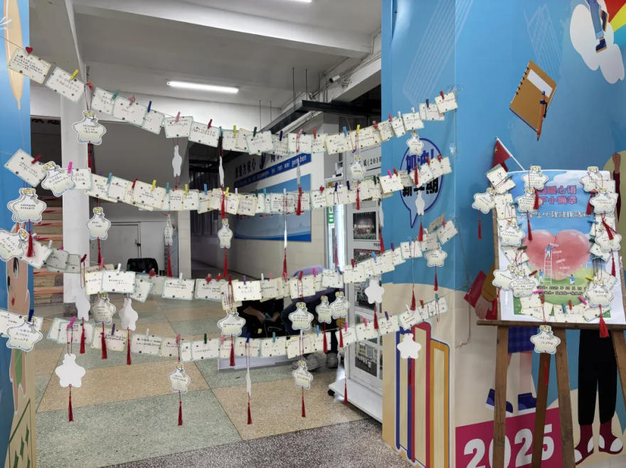 活动无需正襟危坐,不必袒露心声,学子们课间路过即可参与。大家可以自由挑选触动心灵的暖心话语卡片带走,也能写下专属暖心寄语贴上墙面,将温暖接力传递。参与活动的同学只需与拿走的卡片合影,便可现场领取精美书签一份。