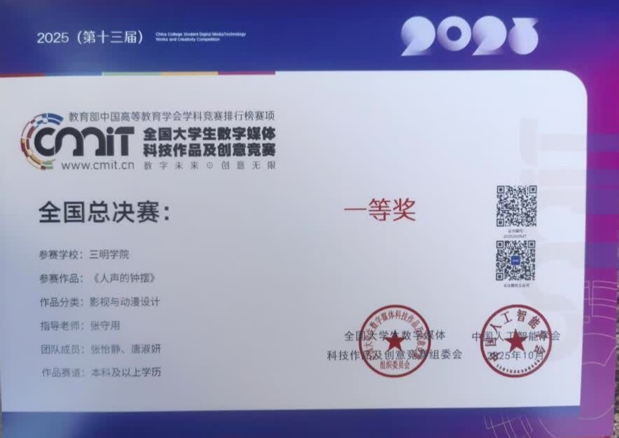 近日,第十三届全国大学生数字媒体科技作品及创意竞赛全国总决赛结果揭晓,我校海峡理工学院张怡静、唐淑妍同学的作品从众多参赛作品中脱颖而出,荣获全国一等奖,创下我校在该项赛事中的历史最佳成绩。