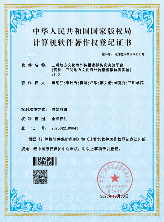近日,由海外学院(外国语学院)教师团队原创研发的“三明地方文化海外传播虚拟仿真实验平台”正式获得中华人民共和国国家版权局颁发的计算机软件著作权登记证书(证书号:软著登字第16765241号)。这是学院持续推进党建与事业发展深度融合,推动学科建设与地方文化协同发展,在“新文科”建设与数字化教学改革方面取得的又一标志性成果。