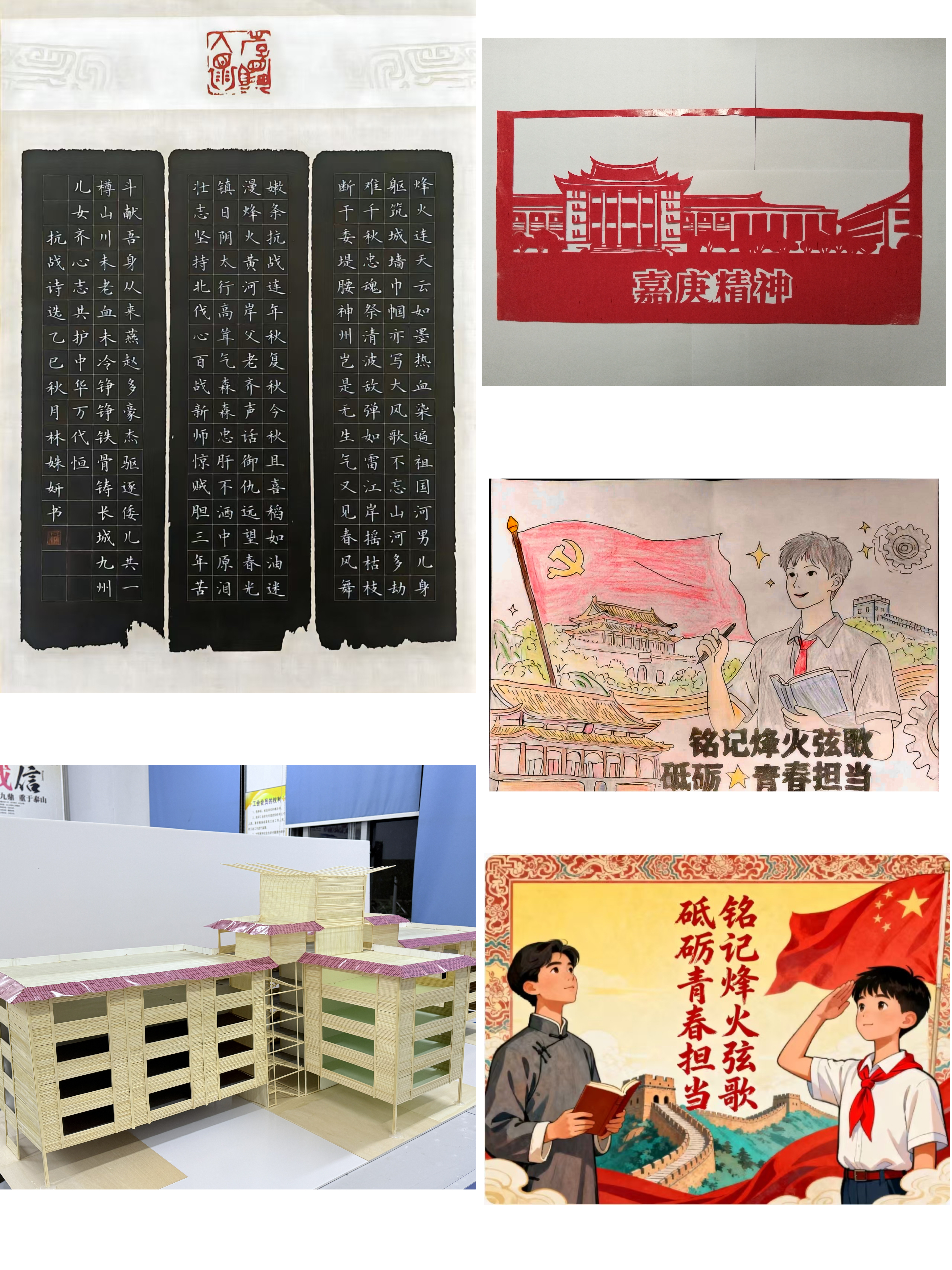 为深化理论学习成果,各二级学院结合学科专业特色,组织团员以多元艺术形式诠释嘉庚精神与烽火弦歌历史,累计收集创意作品300余份,以丰富载体让精神内涵可视可感。活动中,团员青年充分发挥创意与专业优势,以绘画、剪纸、海报创作细腻勾勒嘉庚先生办学时的坚毅神情、描绘师生内迁途中的执着身影;以笔墨传情书写嘉庚先生“教育为立国之本”“华侨旗帜,民族光辉”等经典语录,借遒劲笔墨与章法韵味彰显对其爱国奉献、教育救国理念的传承;还运用新媒体手段拍摄制作短视频,展现青年一代对嘉庚精神的深刻领悟;同时深挖历史细节撰写原创剧本,借情景演绎再现艰苦环境下师生坚持授课的场景,字里行间饱含的爱国情怀引发强烈情感共鸣。