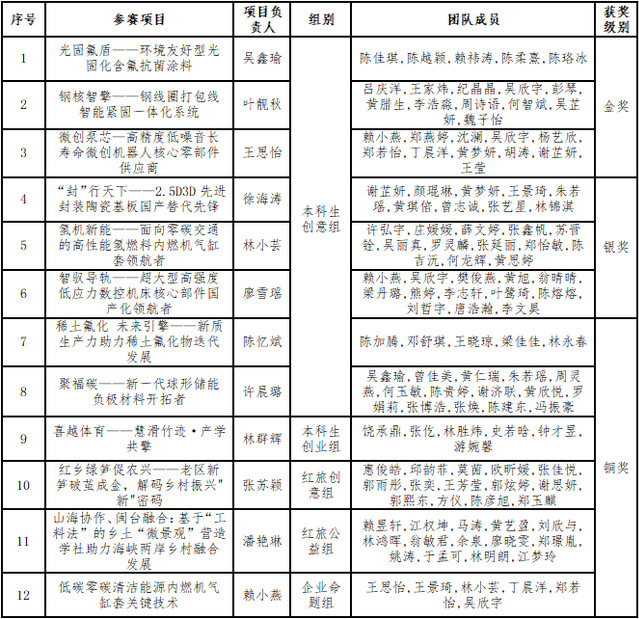近日,福建省大学生创新大赛(2025)获奖名单正式公布,我校学子获3金3银6铜,肖旺钏、高辉、高艺三位教师获省“优秀创新创业导师”称号,“光固氟盾”“钢核智擎”“微创泵芯”“智驭导轨”等4个项目获推参评国赛。