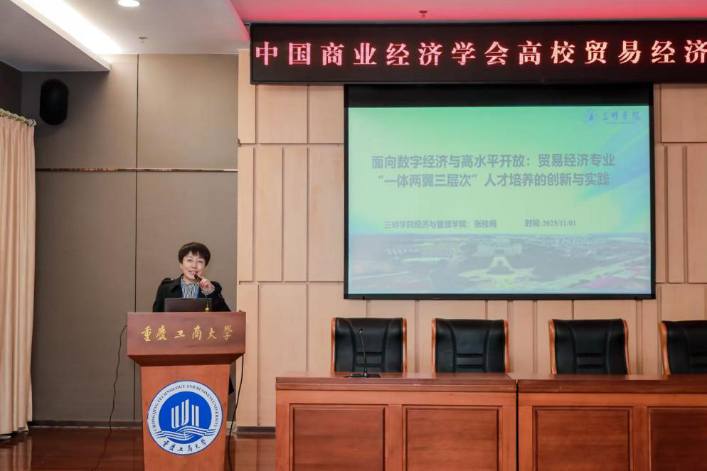 在会上,张桂梅副院长作了《一体两翼三层次:贸易经济人才创新实践》的主题报告,系统展示了我校在贸易经济人才培养方面的创新成果。报告重点介绍了我校构建的“一体两翼三层次”培养体系,即以复合型商贸人才培养为主体,以数字贸易和国际商务为两翼发展方向,面向普通本科、专升本和来华留学生实施分层分类培养的特色模式,分享了我校在政产校协同育人方面的创新实践,获得了与会专家的高度认可。
