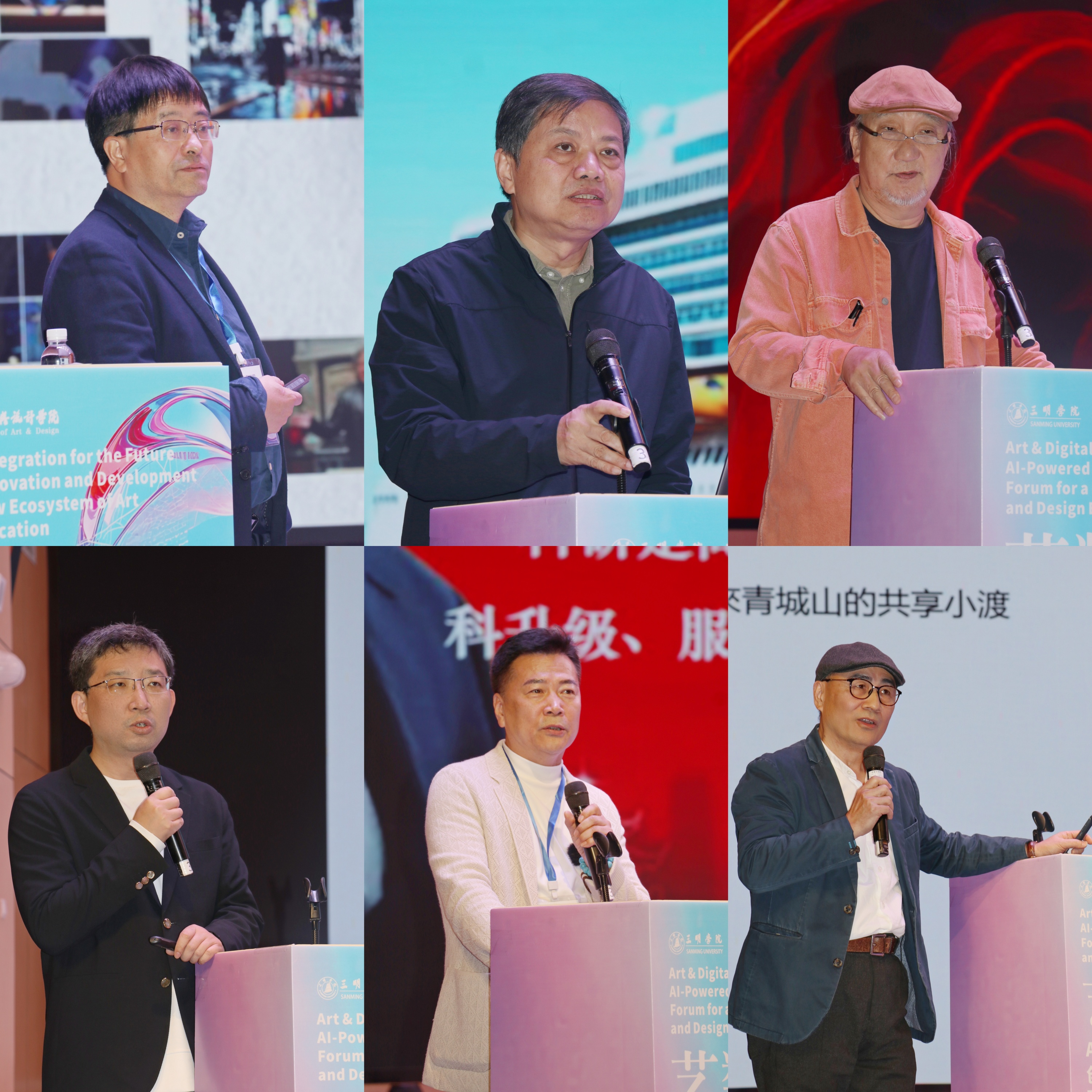 开幕式后,8场高水平主旨报告依次展开。浙江大学孙守迁教授从智能技术驱动的创新方法论出发,探讨了人工智能重塑创新设计的新维度;武汉理工大学潘长学教授聚焦教育体系重构,阐述了面向AI时代的设计教育战略转型;东华大学冯信群教授提出了“大设计·超时尚”理念,重新定义AI时代的设计边界与美学范式;苏州大学李正教授从交叉学科视角,探讨了设计格局重塑与思维创新;中国传媒大学吕欣教授剖析了生成式AI与智能创作的融合路径,揭示了技术赋能下的创作新可能;中央美术学院卓凡教授通过“AI是设计师大脑的延伸”的哲学思考,深化了人机协同的认知维度;青岛大学张成义教授结合科研创新与教学实践,系统阐述了艺术学立项与艺术设计教育的共生发展路径;三明学院许立杰教授则从实践视角,探讨了AI赋能设计教育的时代机遇。