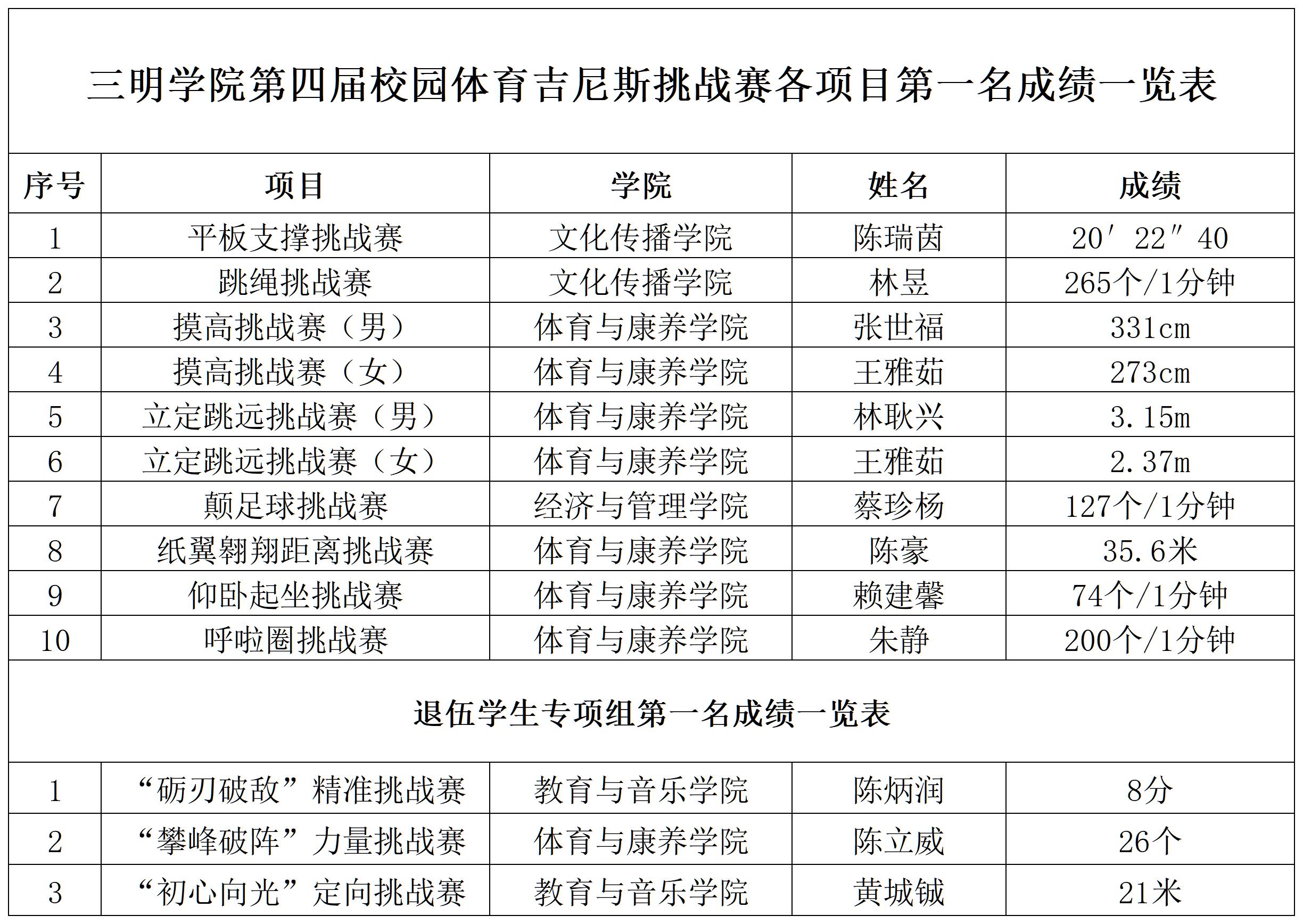 11月15日-19日,三明学院第四届“校园体育吉尼斯”挑战赛在体育馆广场及南区田径场顺利举办,各二级学院共有521名学生报名参加,在赛场书写青春风采。