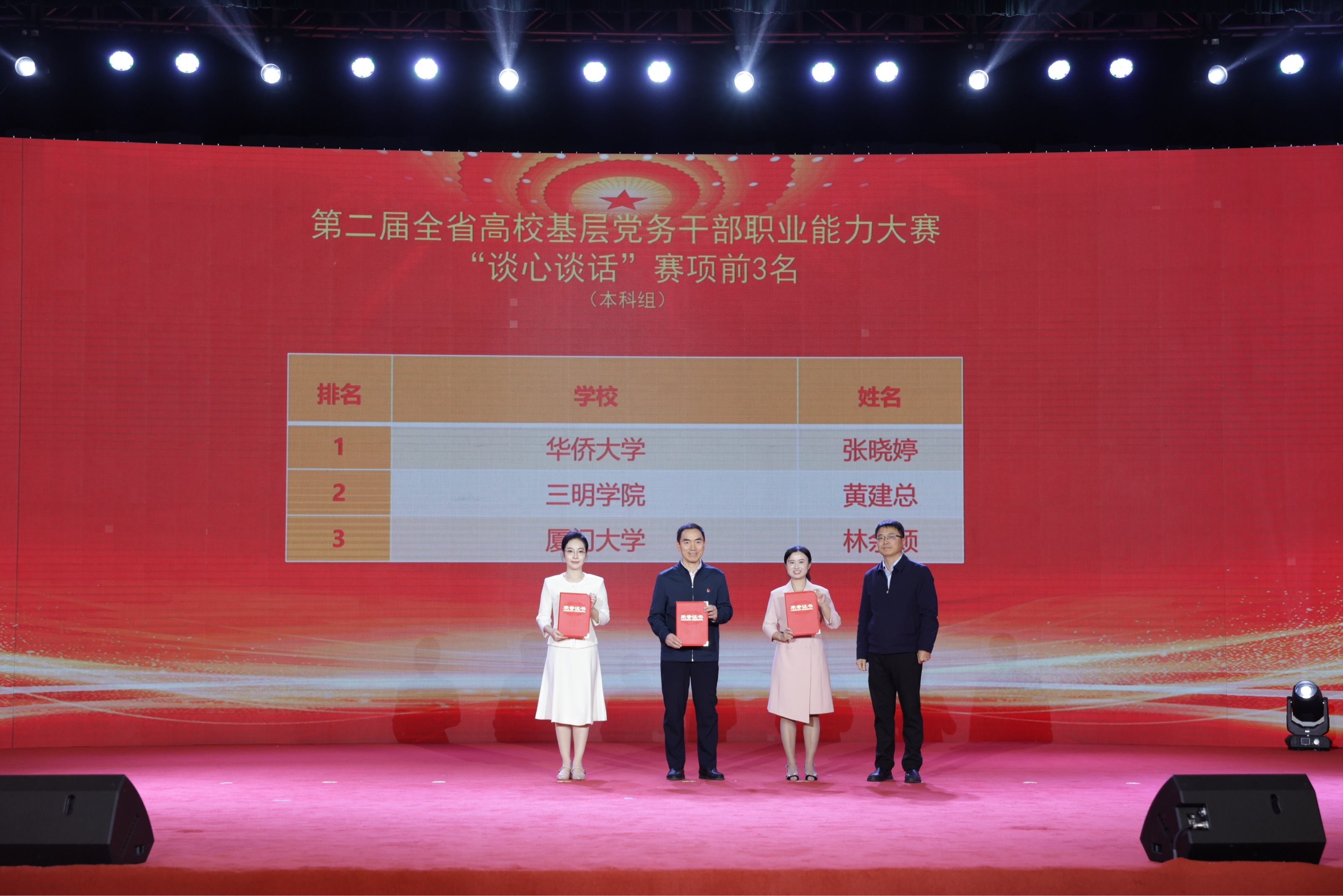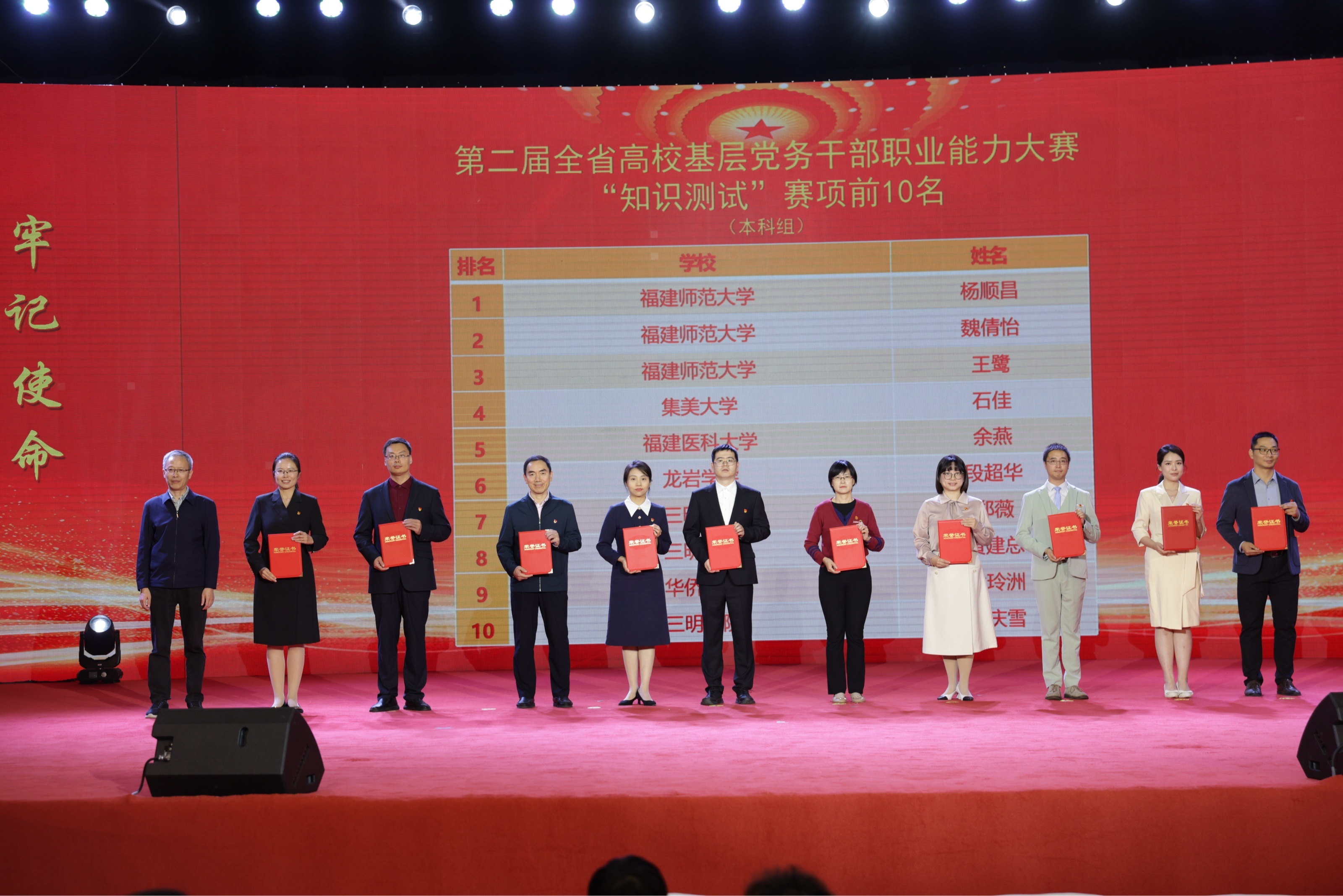 本次大赛设置“知识测试”“主题党日策划”“微党课”“谈心谈话”4个赛项,旨在贯彻落实全国、全省高校党的建设工作会议精神,进一步提升高校基层党务干部政治素质和业务能力,是全省高校基层党建工作成果的一次集中展示与交流。三明学院三位参赛选手凭借扎实的理论功底、精湛的专业素养和稳定的现场表现力,一路过关斩将,充分展现了我校基层党务工作者过硬的职业素养和昂扬向上的精神风貌。