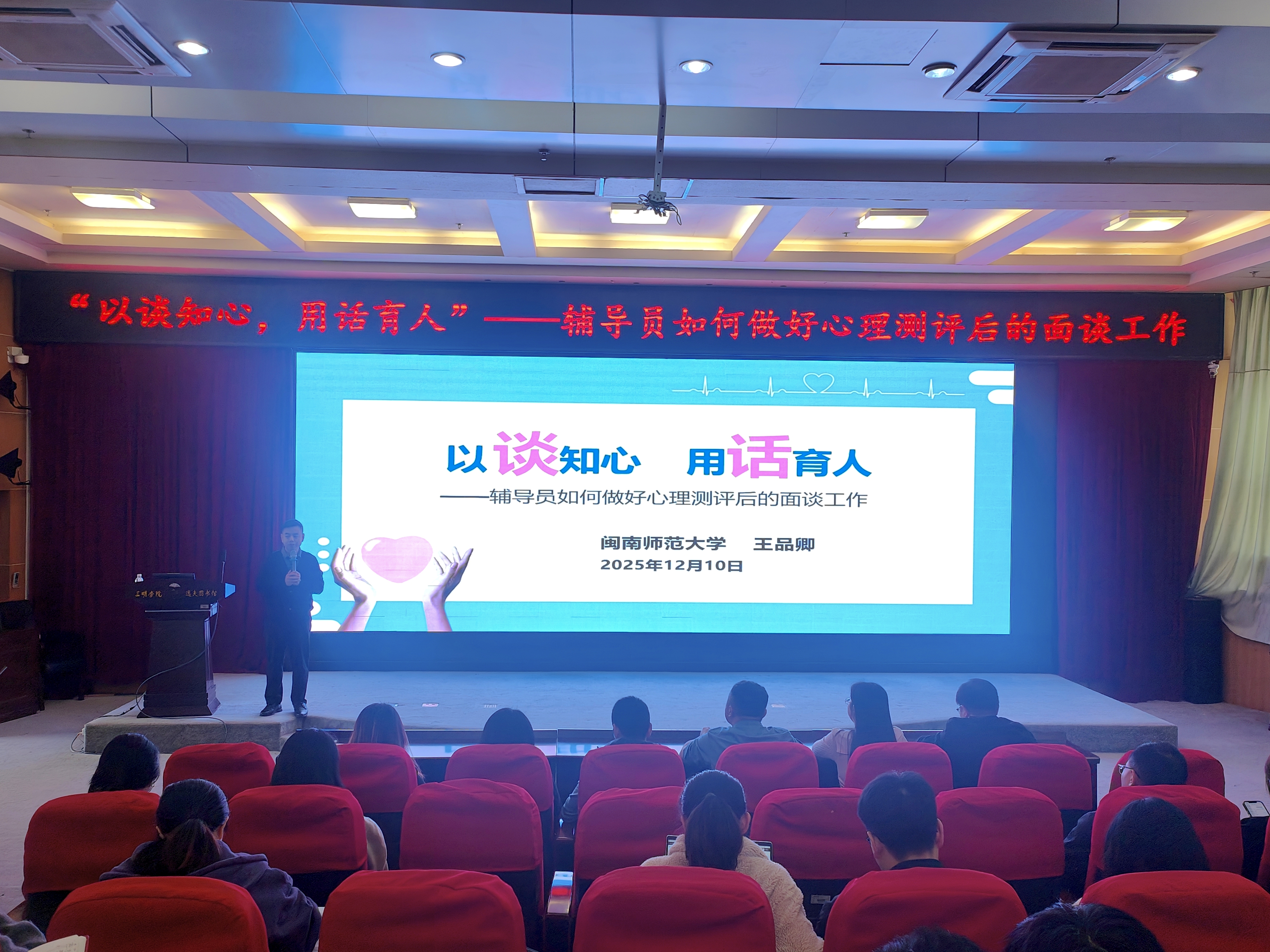 12月10日上午,我校学生工作处举办“以谈知心,用话育人——辅导员如何做好心理测评后的面谈工作”专题讲座。来自闽南师范大学心理健康教育咨询中心王品卿副教授为全校辅导员带来了一场既有理论深度又具有实践指导意义的精彩讲座。全校专兼职辅导员、心理中心专职教师等参加了此次活动。