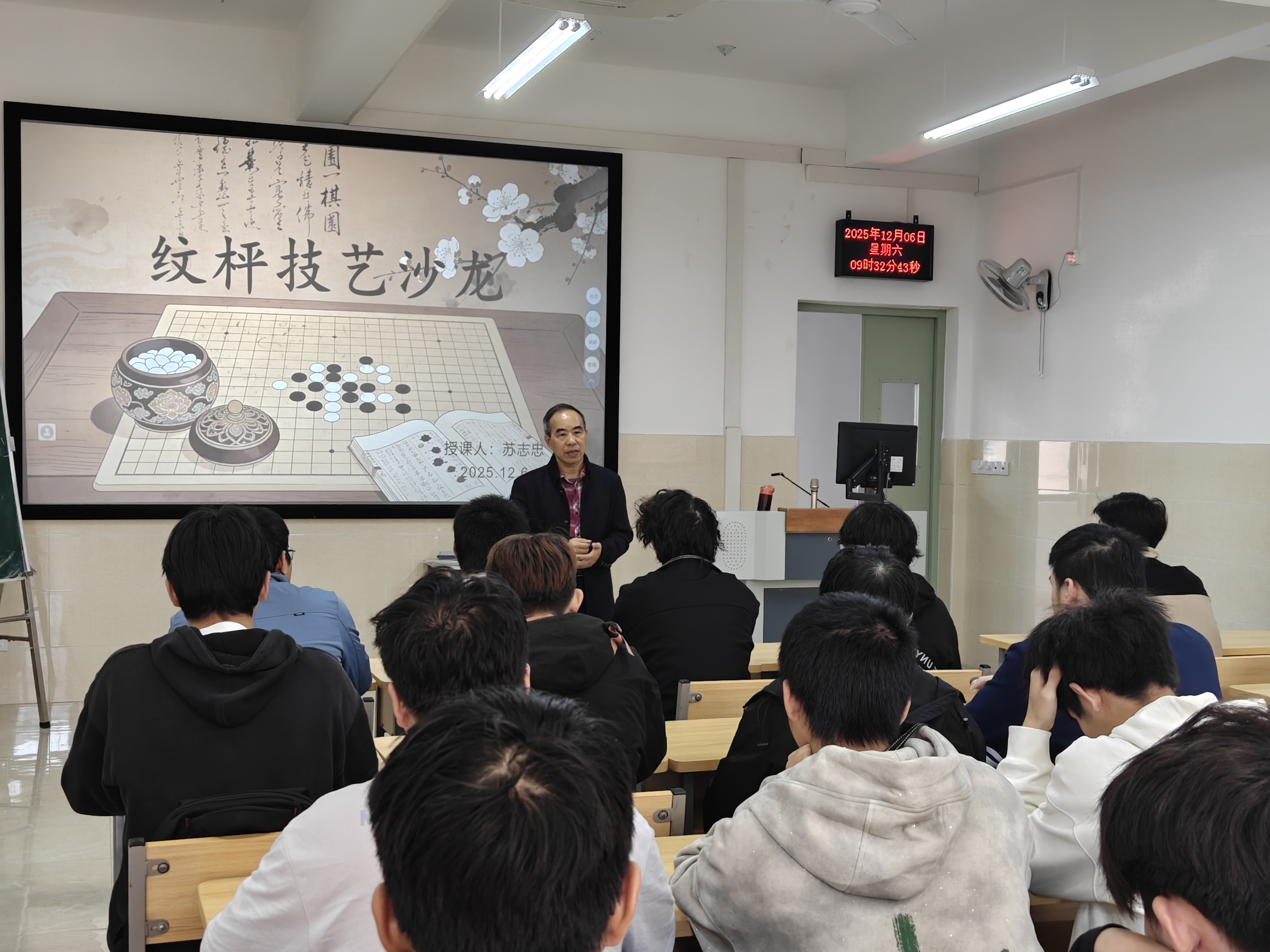 活动现场氛围庄重而轻松。苏老师借助大屏幕上的对弈实例,从围棋的历史起源与基本规则讲起,逐步解析棋子布局、死活题解题等核心技巧,并巧妙融合围棋中蕴含的逻辑思维与人生哲学,以通俗易懂的语言,将抽象的战略战术娓娓道来,引人入胜。台下同学们全神贯注,时而凝神聆听,时而沉思棋路,记录重点内容。互动环节中,苏老师耐心解答大家的疑问,从基础落子到高阶思路,层层展开讲解,现场交流气氛热烈。参与同学不仅学到了围棋知识,也深切体会到中华传统棋艺的深厚魅力。