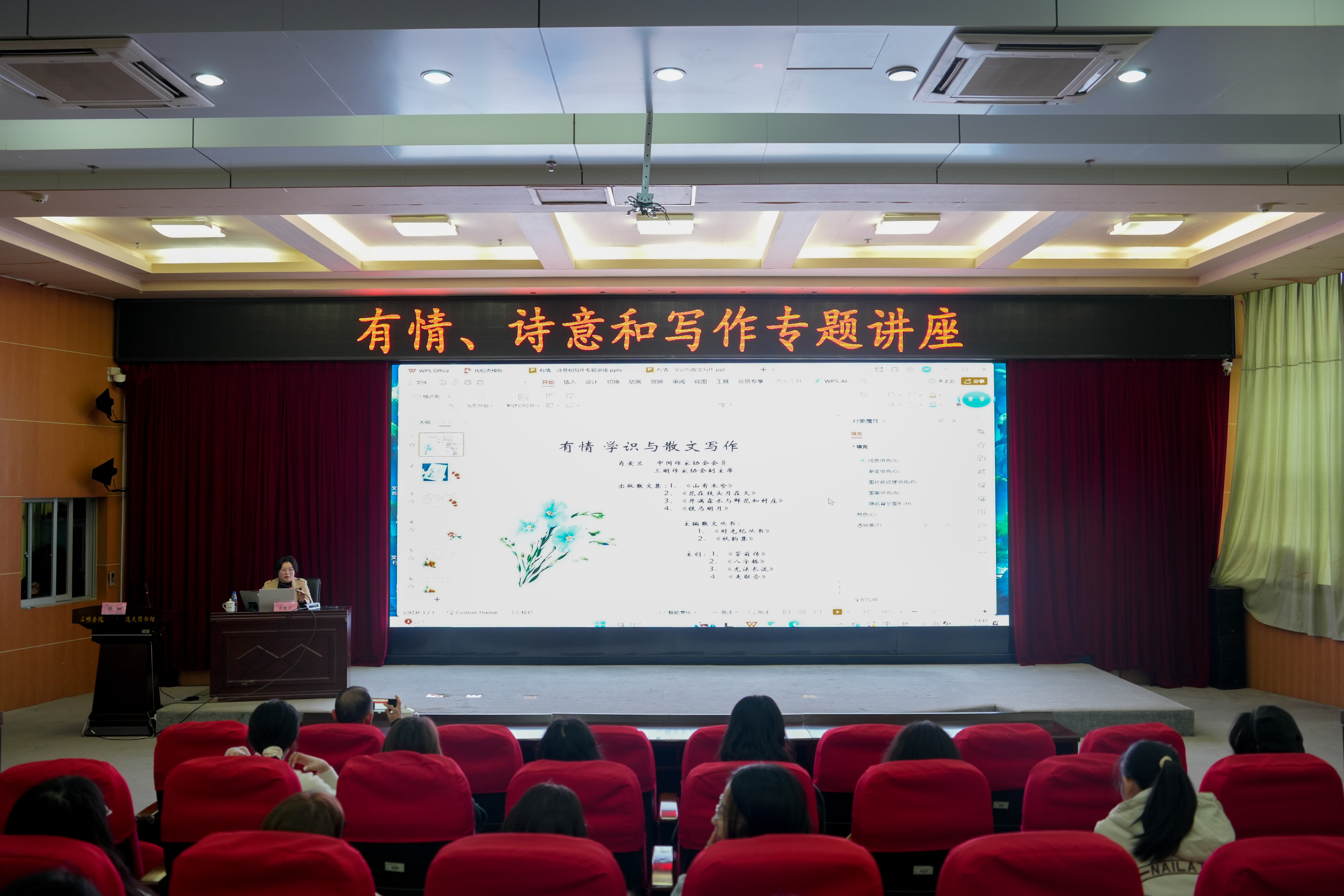 讲座中,肖爱兰副主席以“有情、诗意和写作”为题,围绕“AI与写作的平衡”展开深入剖析,指出在人工智能飞速发展的当下,写作既要善用技术赋能,更要坚守人文内核,不能让算法消解文字的温度。随后,她聚焦散文创作,强调情感真挚、视角多元与社会关怀是散文的灵魂所在,并以《山河袈裟》为例,细致解读作品中蕴含的生命体悟与人文情怀,让在场师生对散文写作有了更深刻的认知。她还分享了“学识的跨界与散文的破壁”的创作心得,鼓励同学们拓宽知识边界,打破文体桎梏,在跨界融合中迸发写作灵感。