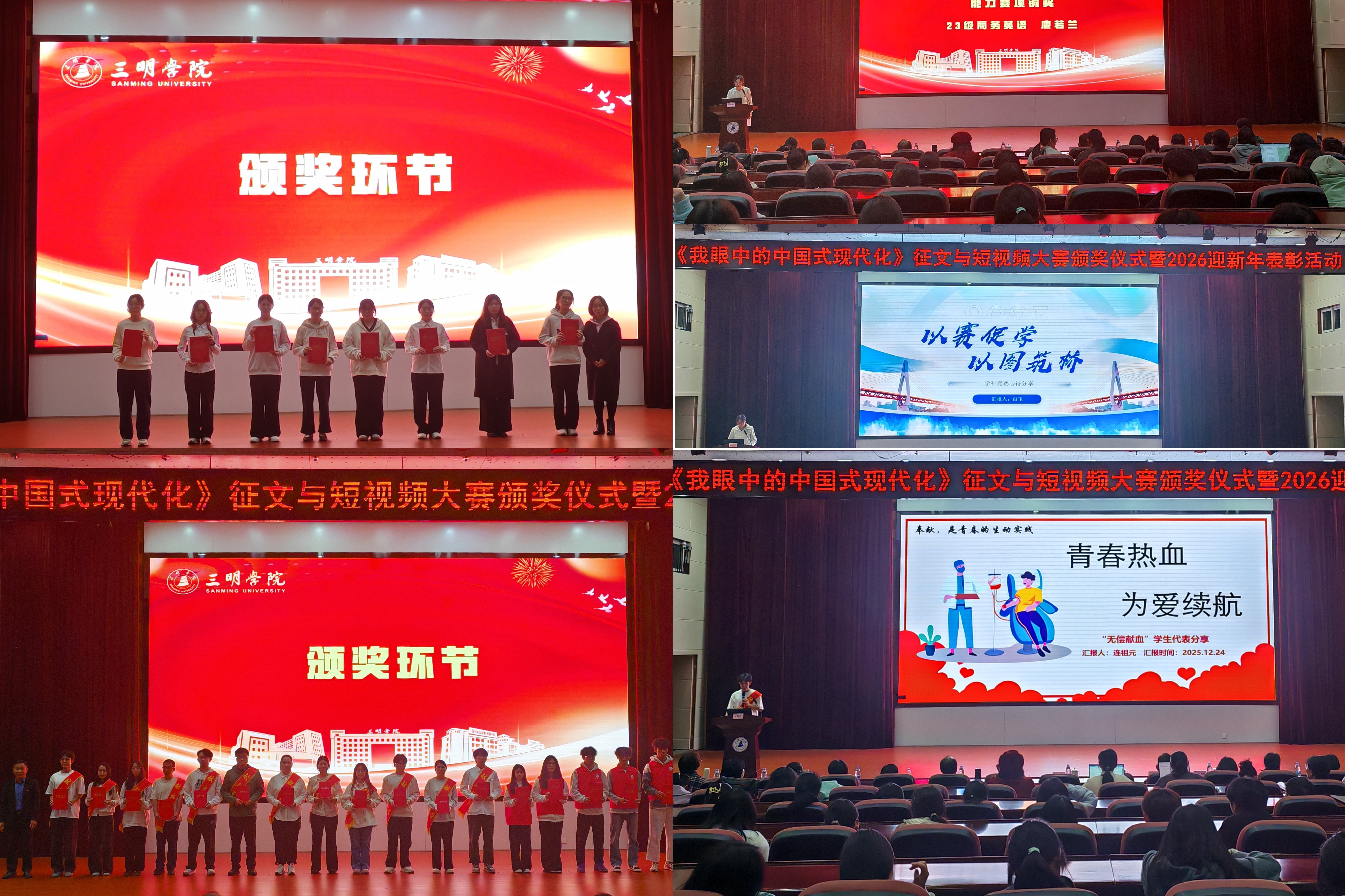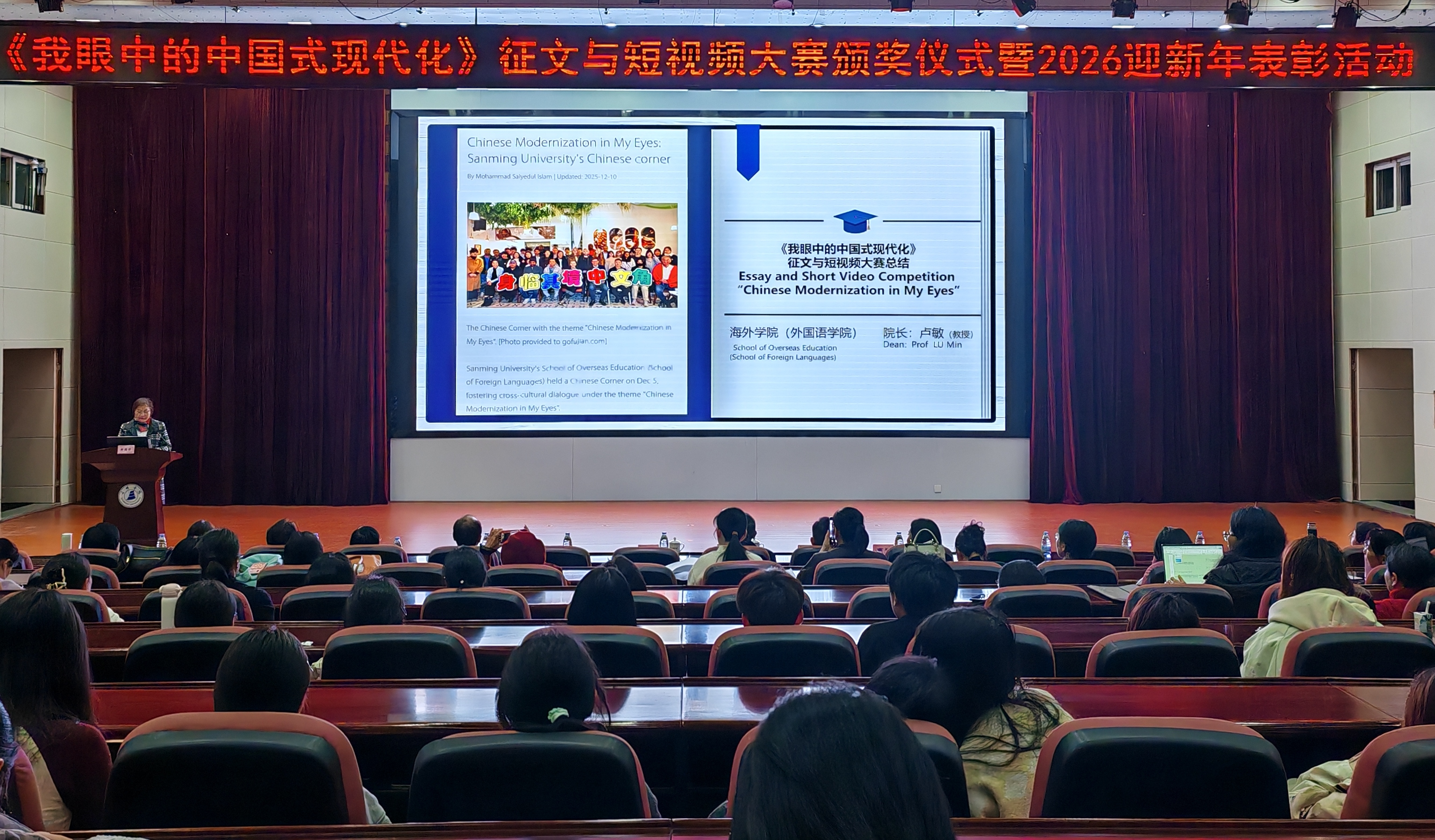 为深入领悟中国式现代化的宏伟蓝图与丰富内涵,凝聚全院师生奋进力量,12月24日下午,海外学院(外国语学院)在北区行政附楼学术报告厅举办《我眼中的中国式现代化》征文与短视频大赛颁奖典礼暨2026迎新年表彰活动。校党委委员、副校长林建伟出席,对外合作与交流处、海外学院(外国语学院)党政领导、全体教师以及400名学生代表参加了此次典礼。
