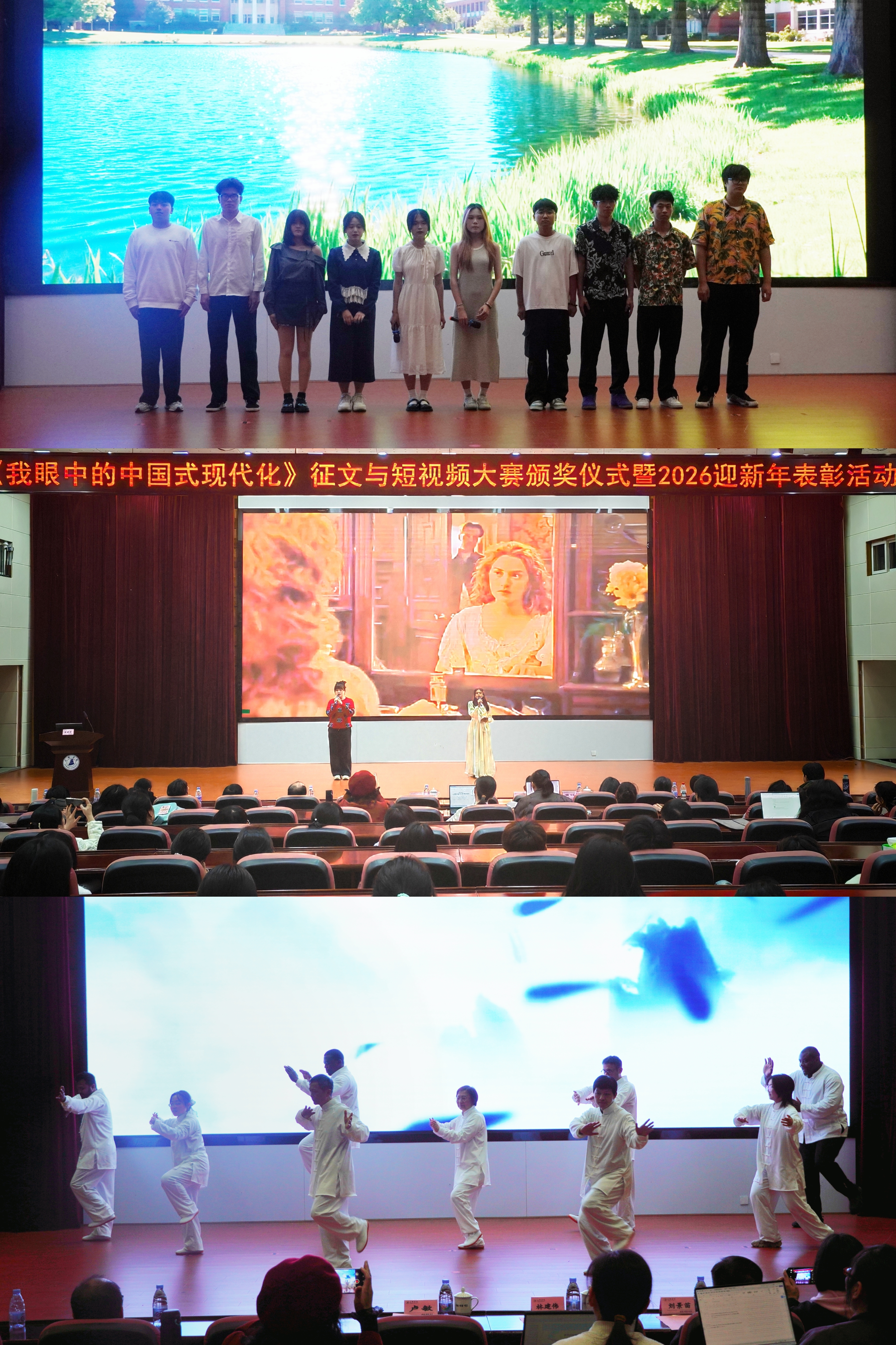 活动围绕获奖作品展播、获奖师生心得分享、荣誉先进表彰等展开。来自孟加拉国的AFRIN JAHAN和ZARIF ABDULLAH分别用生动影像诠释对中国式现代化的理解与思考。大赛获奖代表帅建博士结合自身在中国学习生活经历分享了自己的创作思路与感悟。在荣誉先进表彰环节,学院对各类竞赛、评优中以及公益献血等先进团体和个人进行了表彰,获奖代表23级商务英语廖若兰、23级土木工程白玉两位同学围绕备赛规划、夯实根基、心态调整等方面作经验分享。无偿献血代表23级英语(师范)连祖元在分享中呼吁大家加入到献血行列,彰显青年学子的责任与担当。活动过程中,原创心理情景剧《魅力太极》《冲破枷锁》进行了展演,中外师生同台歌曲联唱,活动内容丰富多彩,现场氛围热烈融洽。