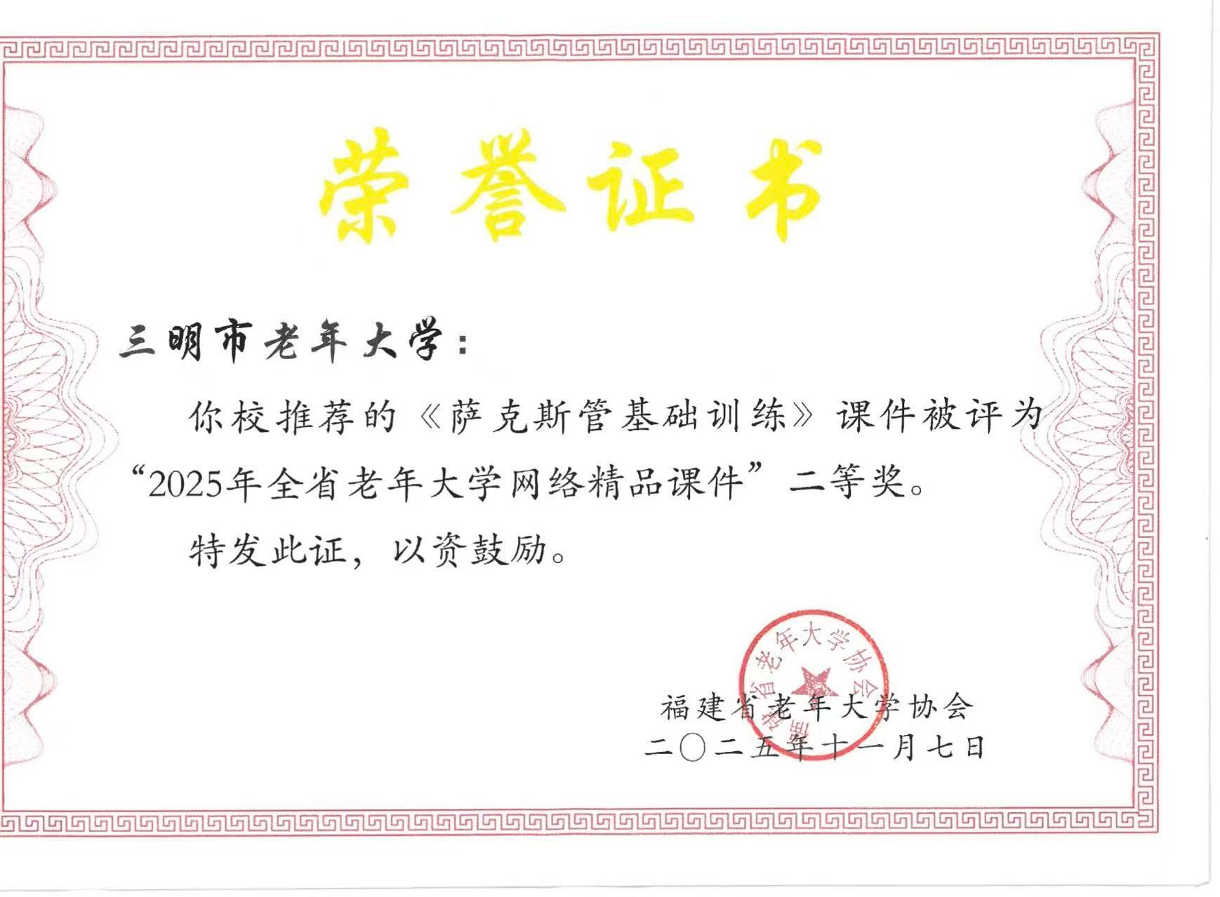 近日,三明学院教育与音乐学院、苏区美育发展学院帮扶三明市老年大学研发的《萨克斯管基础训练》数字教材课件,在2025年全省老年大学网络精品课件评选中荣获二等奖。这一成果是校地美育帮扶的扎实体现,也是学院推动产学研融合、以实践服务地方老年教育的生动案例。