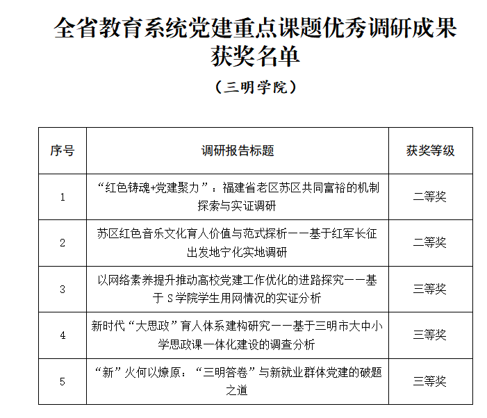 日前,福建省委教育工委公布2025年度全省教育系统党建重点课题调研优秀成果名单,三明学院喜获二等奖2项、三等奖3项,获奖总数位列全省高校首位。