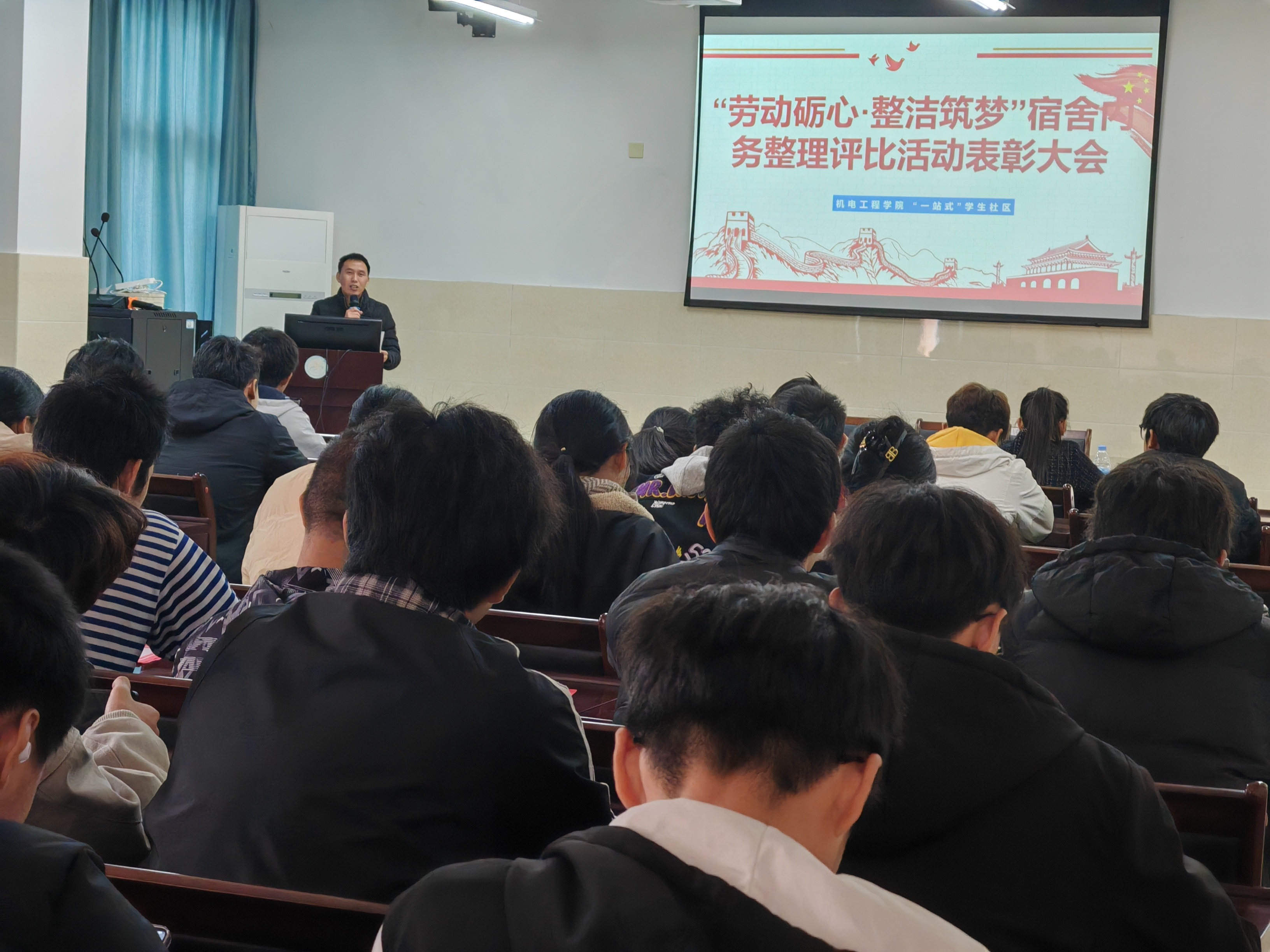 近日,机电工程学院在C603会议室举行2025级新生宿舍内务整理评比活动表彰大会。学院团委相关负责人、辅导员代表及获奖宿舍、先进个人参会。