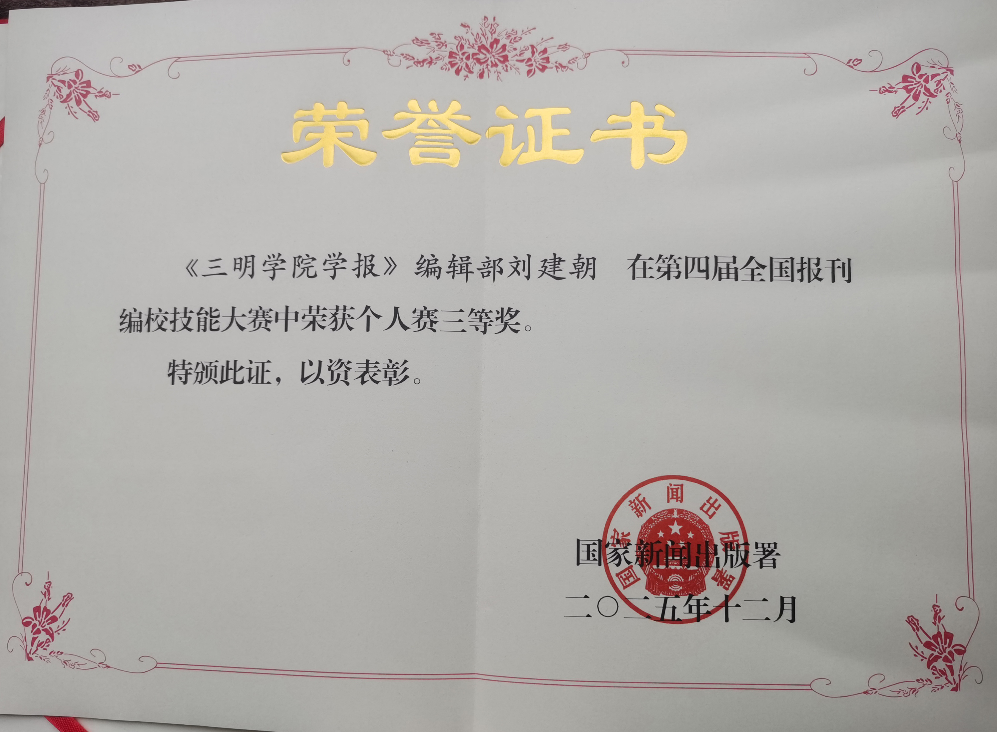 近日,国家新闻出版署发布了《关于表彰第四届全国报刊编校技能大赛获奖选手、团队和单位的决定》(国新出发〔2025〕21号)。在此次全国性高水平专业技能竞赛中,《三明学院学报》编辑部表现突出,刘建朝、肖振家凭借扎实的专业功底和出色的现场发挥,双双荣获个人赛三等奖,在全国舞台上展现了我校编辑人员的严谨作风与专业素养。