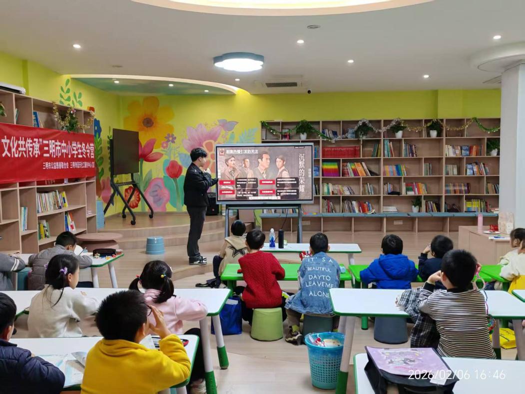 思政教育既要大水漫灌,更要精准滴灌。2月1日与5日,实践队分别走进福州与三明两地中小学冬日营,党员牵头主讲,团员协助搭建互动场景,通过图文课件讲述吴石将军潜伏敌营、传递情报的事迹,阐释吴石将军坚贞不屈的崇高气节。现场,师生与孩子们共同朗诵吴石将军的绝命诗,铿锵有力的诗句回荡在活动现场,爱国种子在少年心田悄然萌发,引导孩子们树立“强国有我”的远大志向。