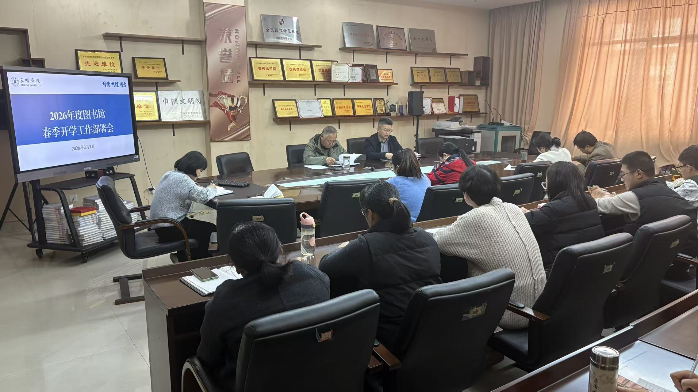 2026年3月7日,图书馆召开全馆大会,重点学习了党的二十届四中全会精神内容,传达学习学校春季工作会议和处级干部学习贯彻党的二十届四中全会精神研讨班精神,研究部署新学期重点工作。