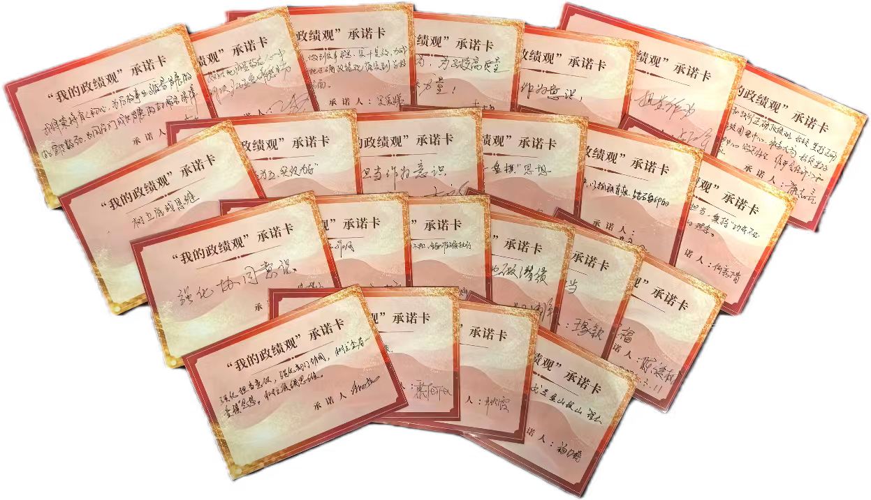 活动现场发放了政绩观正负面清单,全体党员干部对照清单,结合专题学习教育内容及自身岗位职责,撰写政绩观承诺卡,以书面形式明确履职标准和行为底线,在思想深处树立标尺,在履职实践中笃行不怠,推动正确政绩观内化于心、外化于行,确保主题教育成果转化为推动高质量发展的实际行动。