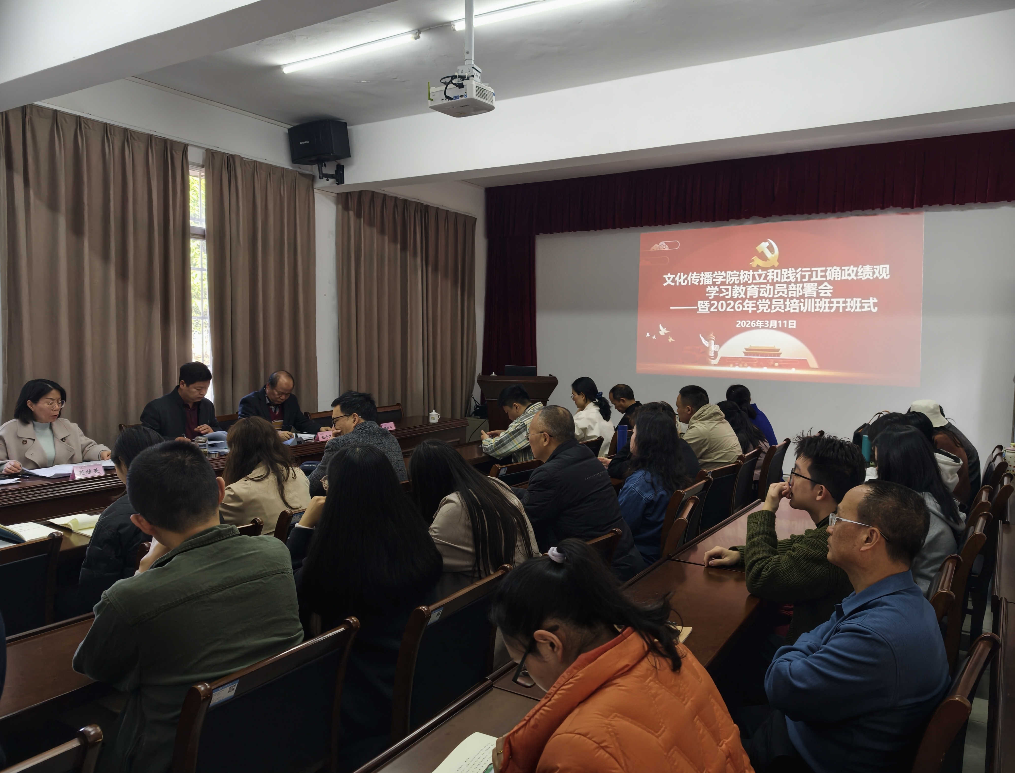 3月11日下午,文化传播学院召开党的建设工作会议,动员部署树立和践行正确政绩观学习教育工作,全面启动学院学习教育各项工作。院领导班子成员、师生党员参加会议。