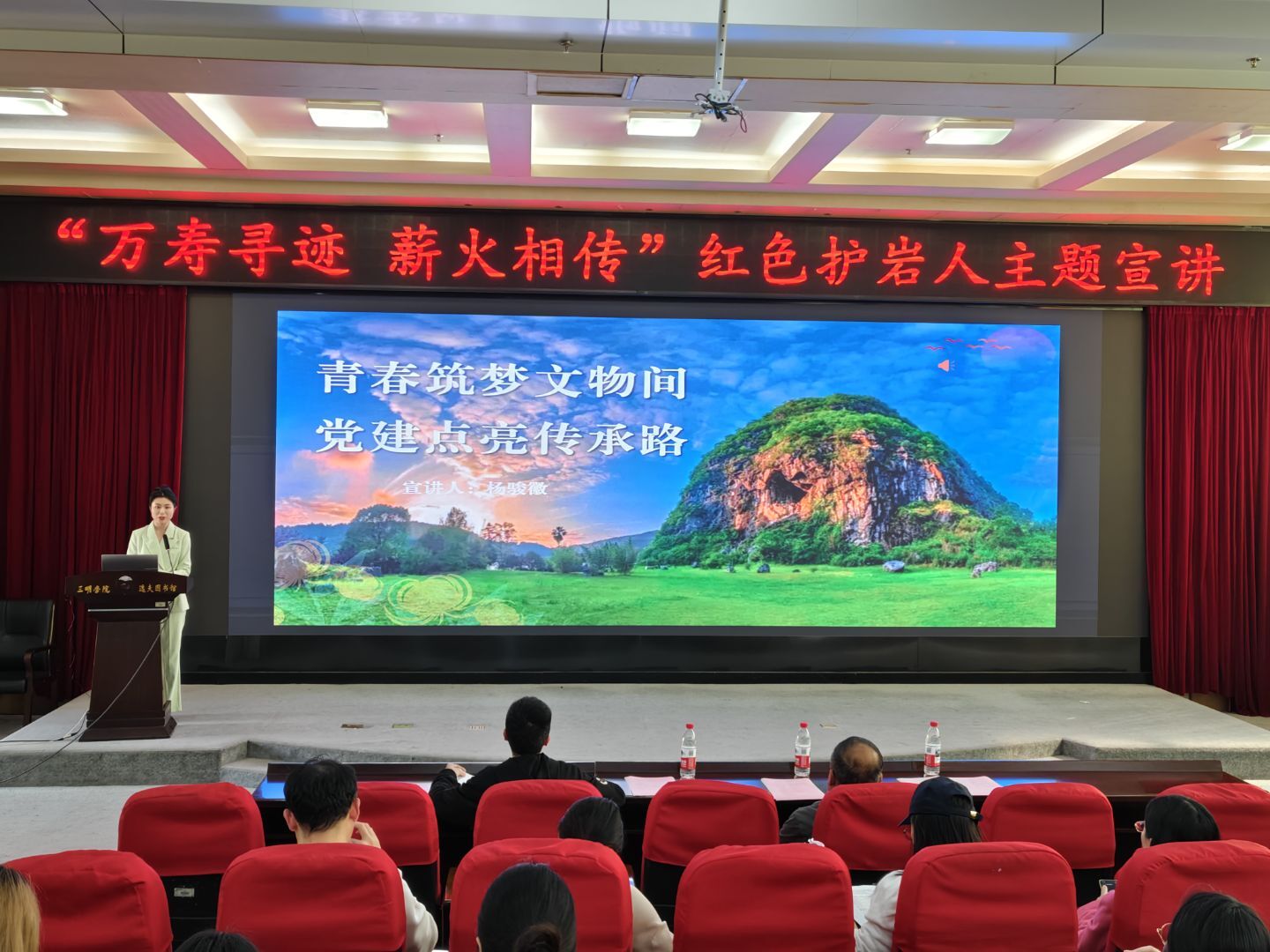 宣讲活动在舞蹈《我和我的祖国》与诗朗诵《巍巍万寿岩》中启幕,悠然的旋律中埋藏对家国与文化的赤诚热爱。万寿岩遗址保护中心宣教科负责人杨骏徽以《青春筑梦文物间,党建点亮传承路》为题,结合数十年遗址保护的鲜活实践与动人故事,生动讲述一代代青年文物工作者的责任与担当,让“护岩人”的精神在青年学子心中生根发芽。随后,朱凯副主任带来专题讲座《保护文化遗产、坚定文化自信——万寿岩遗址的保护利用》,系统梳理了万寿岩从发现、抢救到科学保护、法治建设的完整历程,用详实的数据与珍贵的史料,展现福建在文化遗产保护领域的探索与成就。在互动交流环节,同学们围绕文化遗产保护等话题踊跃提问,思想的碰撞让现场氛围热烈而真挚。
