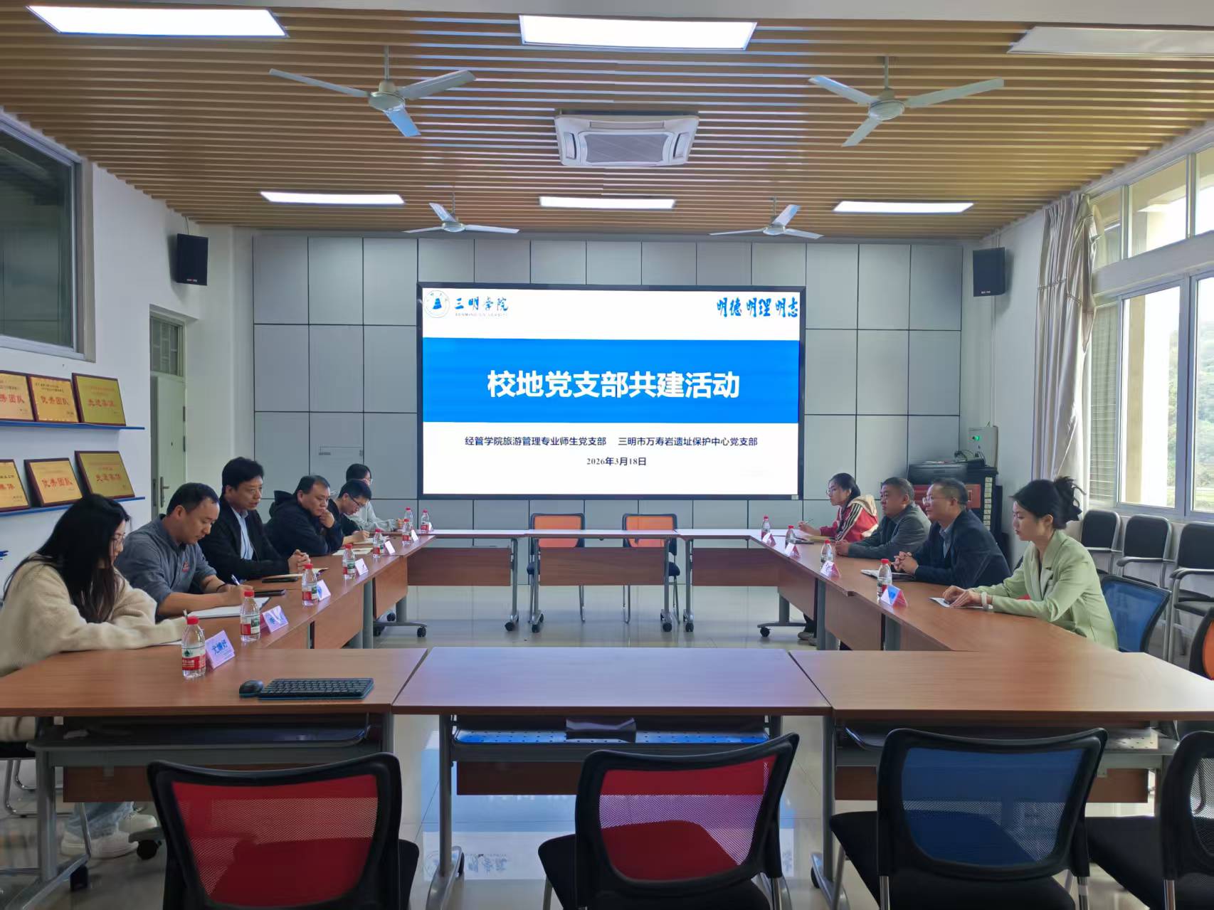 宣讲活动结束后,经管学院旅游管理专业师生与万寿岩遗址保护中心党支部人员移步厚德楼312开展校地党支部共建会议。双方以党建为引领,围绕遗址保护、文旅融合、实践育人等方面深入交流,达成互建共识,推动资源共享、优势互补,以校地联动助力文化遗产传承与专业人才培养。