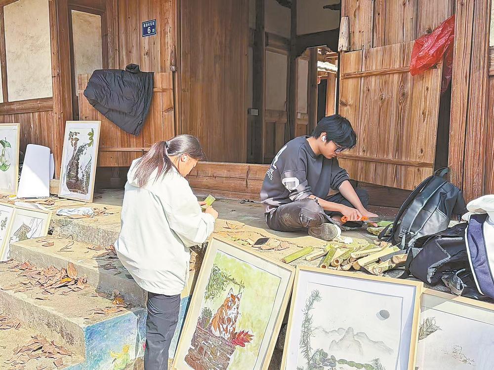 在莘口镇明台瓦坑艺术村,三明学院师生就地取材进行艺术创作。