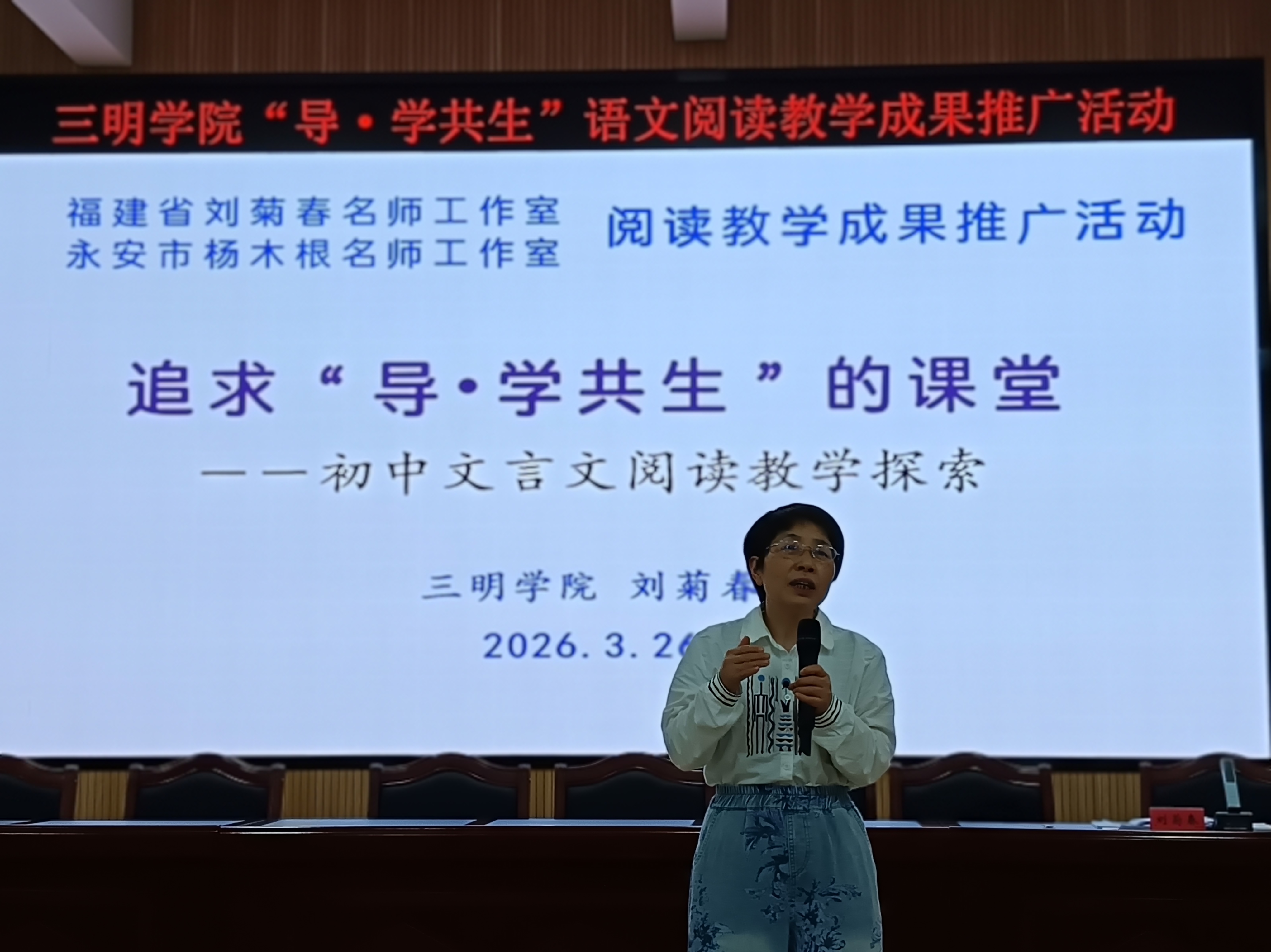 3月26日,文化传播学院“导•学共生”阅读教学成果推广活动在永安市第六中学举行。成果主持人刘菊春教授以“追求‘导•学共生’的课堂——初中文言文阅读教学探索”为题,分享成果团队多年的探索: