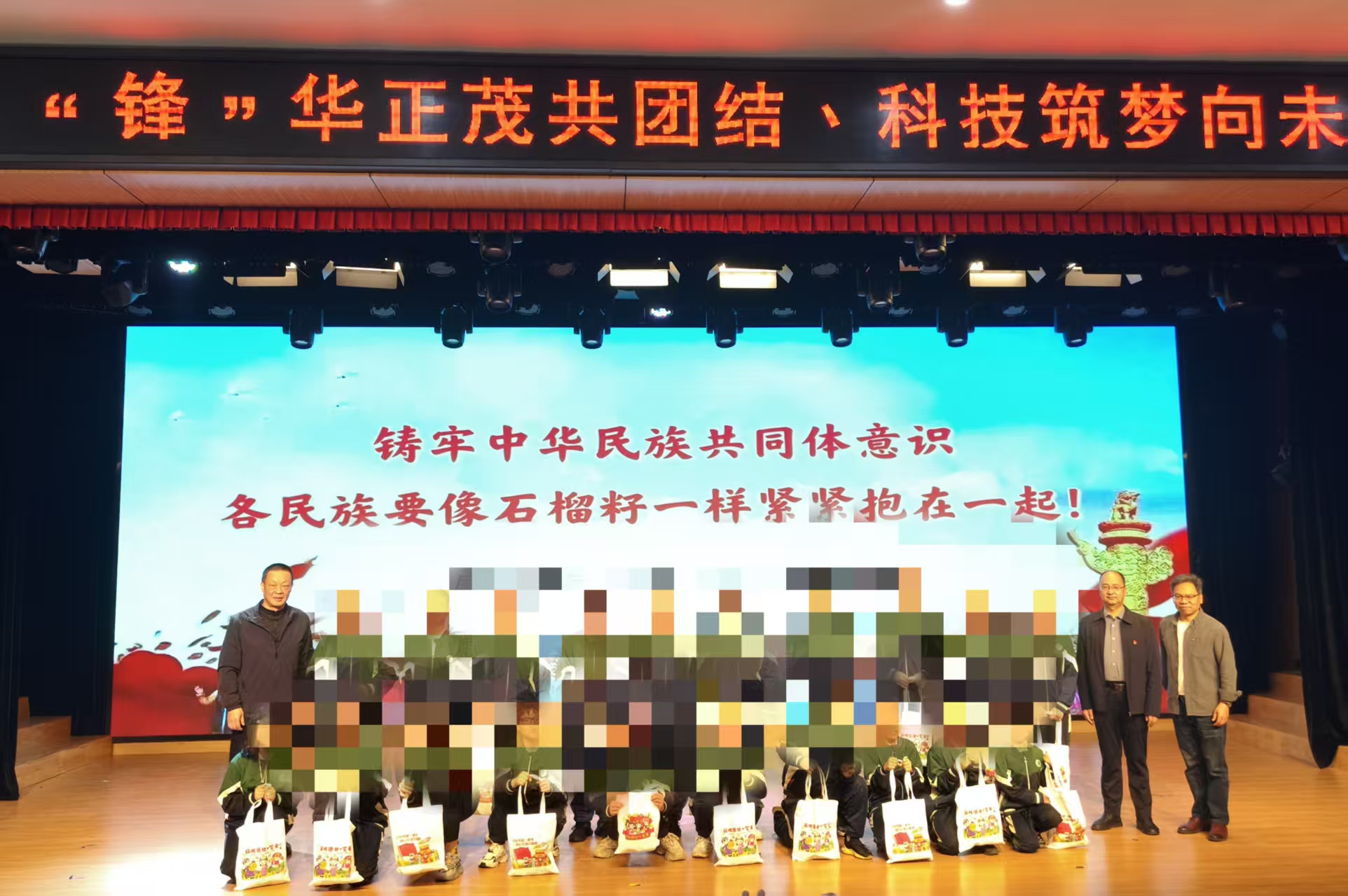 在特校大礼堂,活动在以手语“唱响”国歌中拉开帷幕。在特校老师的手语翻译配合下,学生党员代表带来一堂生动的多样微团课。在雷锋精神篇,学生以雷锋助人为乐的故事为引,结合机电专业志愿服务特色,阐释了新时代“螺丝钉”精神的深刻内涵。民族团结篇则通过观看短视频、有奖竞猜民族图片、少数民族志愿者上台表演等方式,生动地介绍了各民族特色。在欢快的课程尾声,参与活动的领导、老师为特校的同学们送上爱心礼包。